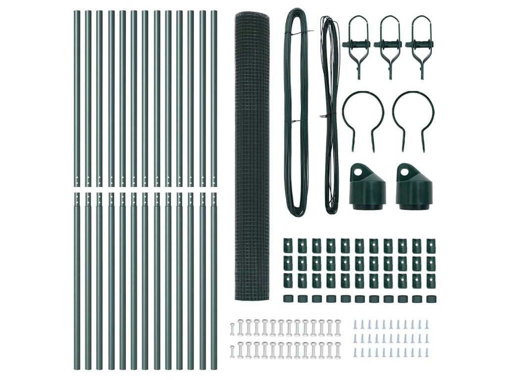 - 1 x Oplocení, 11 x Sloupek, 2 x Úhlový sloupek, 11 x Plastová krytka, 33 x Plastový podpěra napínacího drátu, 2 x Krytka úhlového sloupku, 2 x Hardware úhlového sloupku, 3 x Napínač, 1 x 25 m Vázací drát, 1 x 80 m Napínací drát
