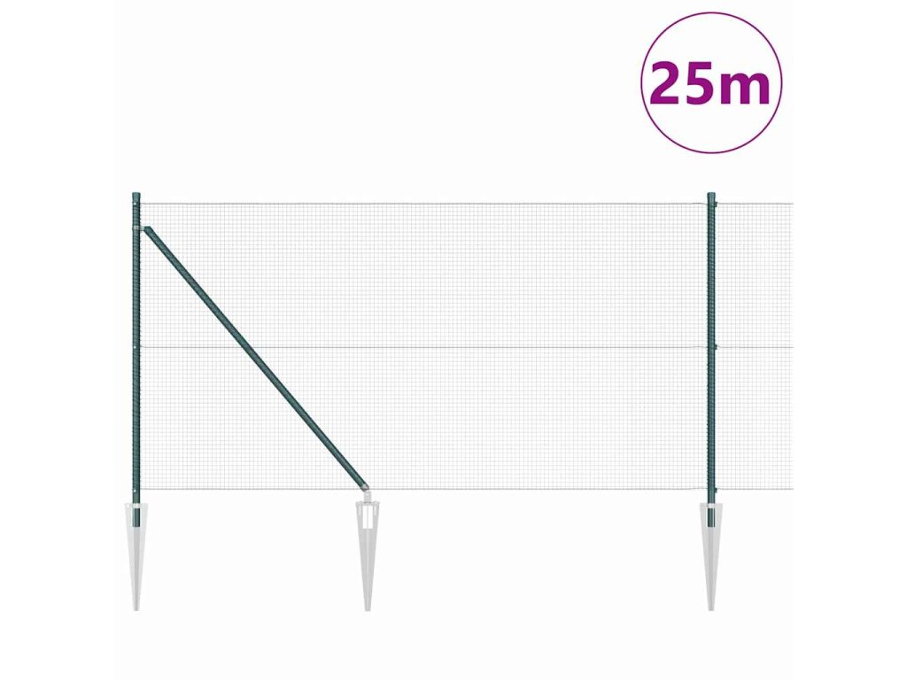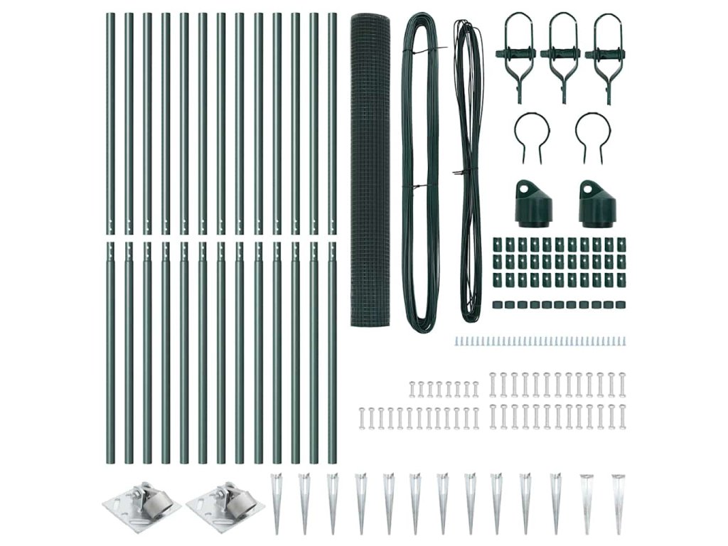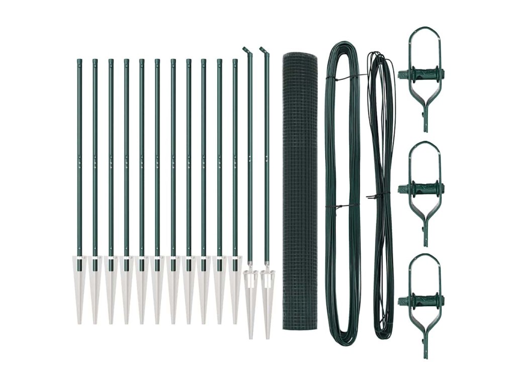 - 1 x Oplocení, 11 x Sloupek, 2 x Úhlový sloupek, 11 x Hrot, 2 x Úhlový hrot, 11 x Plastová krytka, 33 x Plastový podpěra napínacího drátu, 2 x Krytka úhlového slouku, 2 x Hardware úhlového sloupku, 3 x Napínač, 1 x 25 m Vázací drát, 1 x 80 m Napínací drát
