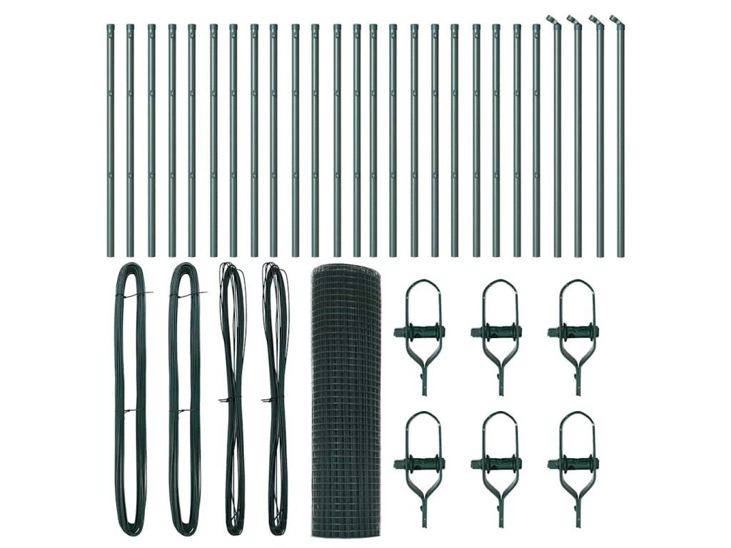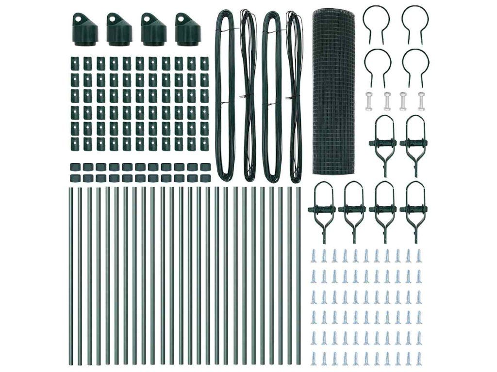 - 1 x Oplocení, 22 x Sloupek, 4 x Úhlový sloupek, 22 x Plastová krytka, 66 x Plastový podpěra napínacího drátu, 4 x Krytka úhlového sloupku, 4 x Hardware úhlového sloupku, 6 x Napínač, 2 x 25 m Vázací drát, 2 x 80 m Napínací drát