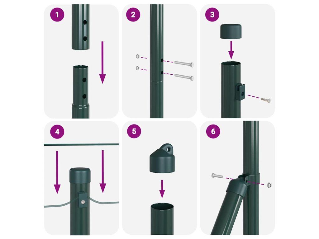 - 1 x Oplocení, 44 x Sloupek, 8 x Úhlový sloupek, 44 x Plastová krytka, 132 x Plastový podpěra napínacího drátu, 8 x Krytka úhlového sloupku, 8 x Hardware úhlového sloupku, 12 x Napínač, 4 x 25 m Vázací drát, 4 x 80 m Napínací drát