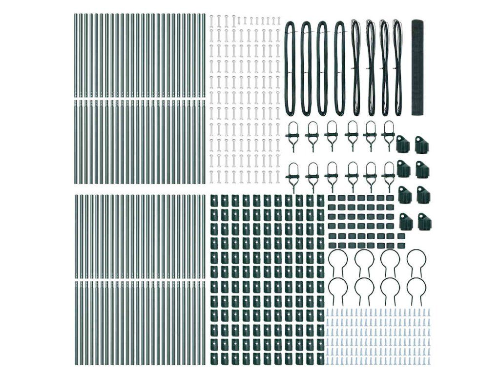 - 1 x Oplocení, 44 x Sloupek, 8 x Úhlový sloupek, 44 x Plastová krytka, 132 x Plastový podpěra napínacího drátu, 8 x Krytka úhlového sloupku, 8 x Hardware úhlového sloupku, 12 x Napínač, 4 x 25 m Vázací drát, 4 x 80 m Napínací drát