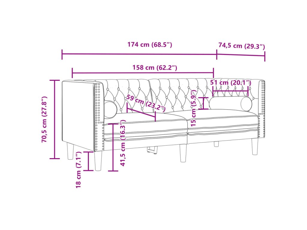 - Styl Chesterfield: Díky klasickému knoflíkovému čalounění opěradla a područek a jejich jednotné výšce pohovka pozvedne každou místnost a zajistí styl i pohodlí.