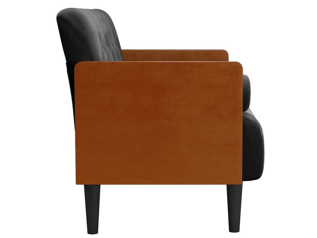 - Poutavý design: Pohovka se vyznačuje kombinací sametové látky a překližkových područek, což umocňuje spojení různých stylistických prvků a přizpůsobuje ji moderním i tradičním interiérům.