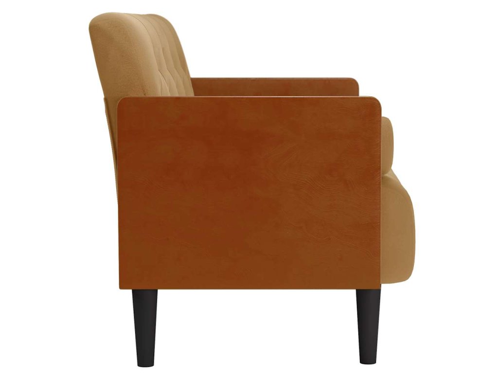 - Poutavý design: Pohovka se vyznačuje kombinací sametové látky a překližkových područek, což umocňuje spojení různých stylistických prvků a přizpůsobuje ji moderním i tradičním interiérům.
