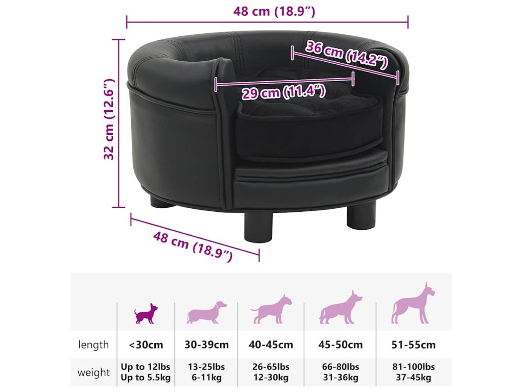 Hustě polstrovaná pohovka má dřevěný rám potažený umělou kůží, která se snadno čistí. Vašim čtyřnohým kamarádům se na ní proto bude moc pěkně odpočívat. Pratelný potah matrace je ušitý z na dotek měkkého plyše pro větší pohodlí. Dřevěné nohy s protiskluzovým designem zajišťují stabilitu a pevnost celé konstrukce. Vnější tělo je také mimořádně odolné, a tak může váš pejsek relaxovat v naprostém bezpečí.