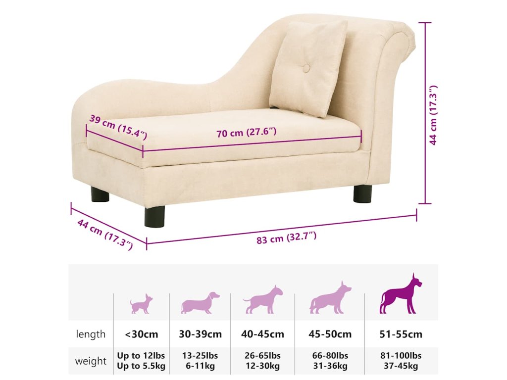 Hustě polstrovaná pohovka pro domácí mazlíčky má dřevěný rám potažený měkkým plyšem, aby se na ní vašim čtyřnohým kamarádům pohodlně odpočívalo. Nohy s protiskluzovým designem zajišťují stabilitu a pevnost celé konstrukce. Polštář navíc poskytuje oporu krku a zad pro absolutní pohodlí. Potah matrace lze vyprat, aby pohovka zůstala krásně svěží.
