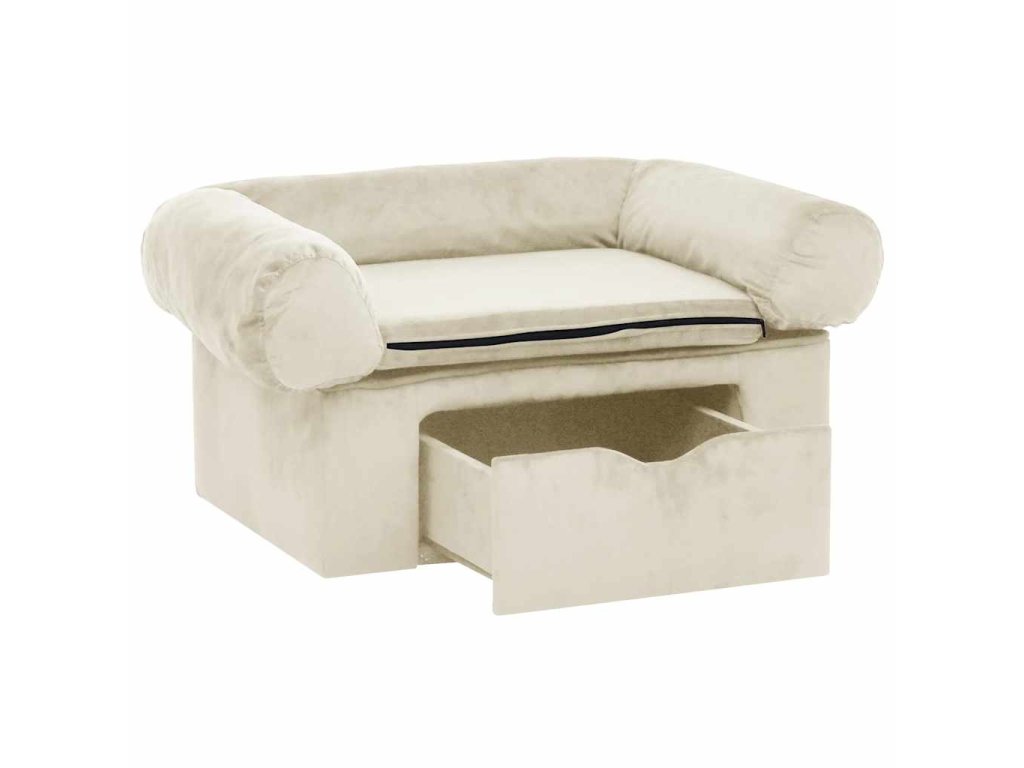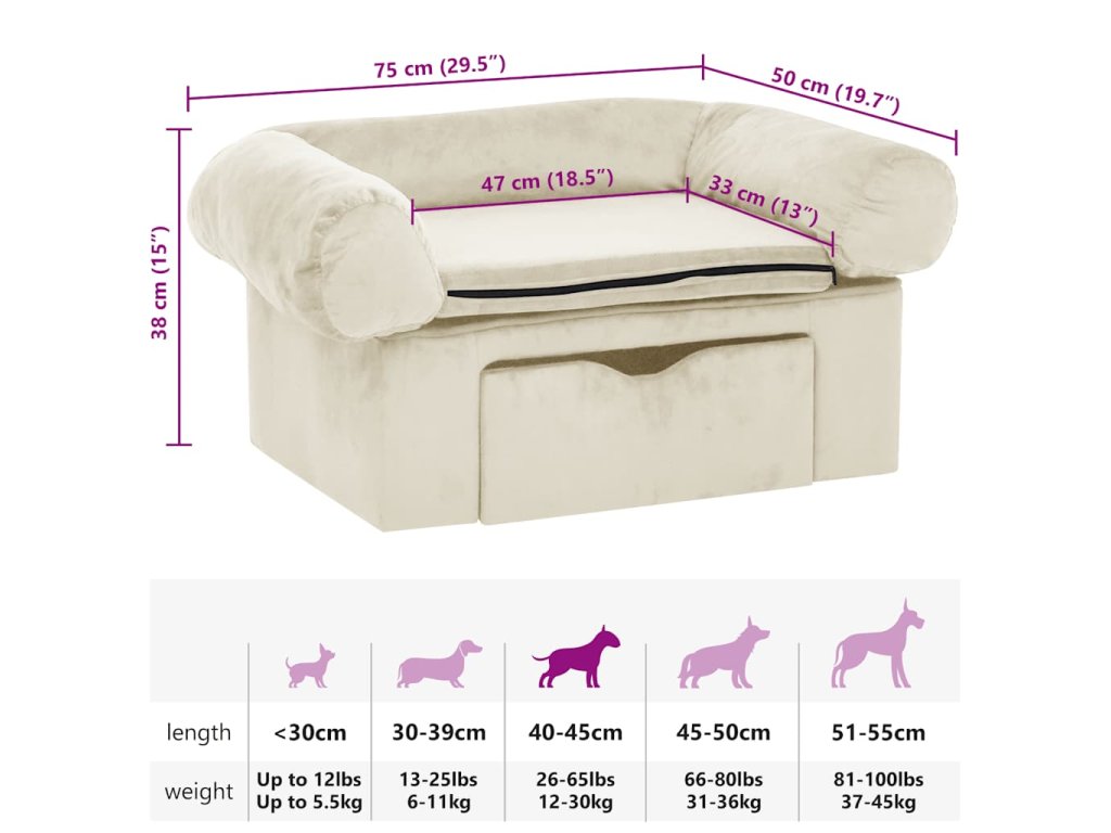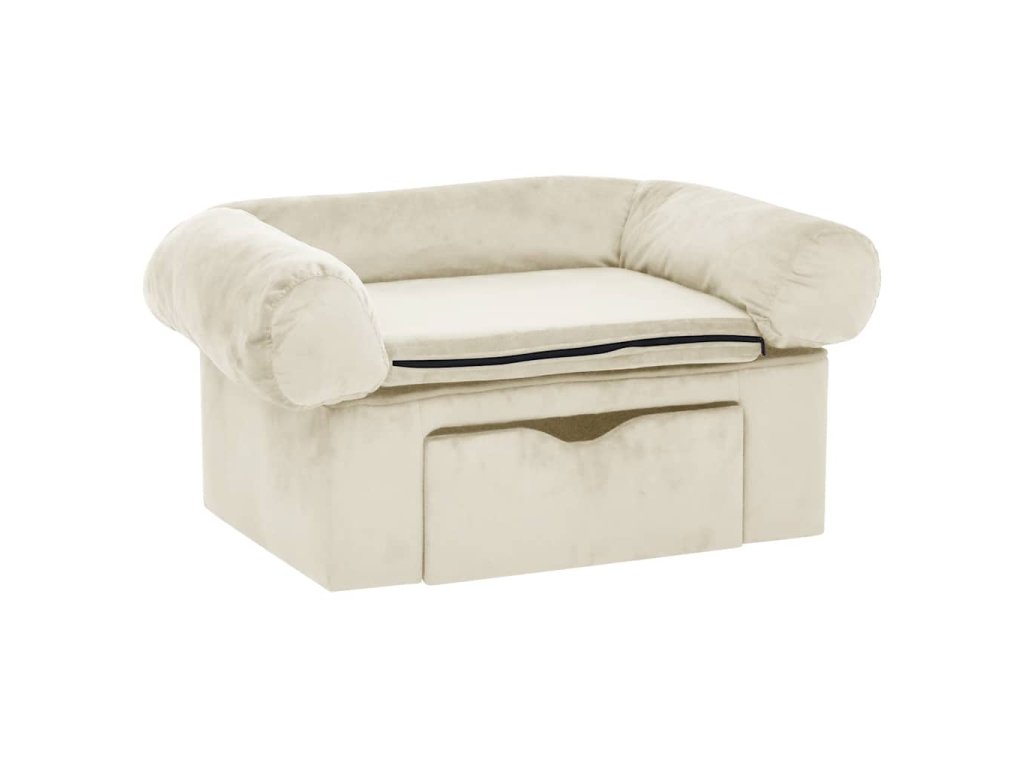 Hustě polstrovaná pohovka pro domácí mazlíčky má dřevěný rám potažený měkkým plyšem, aby se na ní vašim chlupatým kamarádům pohodlně odpočívalo. Ve spodní části najdete zásuvku, kam můžete šikovně uklidit nejrůznější potřeby pro vašeho psa, abyste je měli hezky po ruce. Vnější tělo je také mimořádně odolné, váš pejsek proto může relaxovat v naprostém bezpečí. Potah matrace lze vyprat, aby pohovka zůstala krásně svěží.