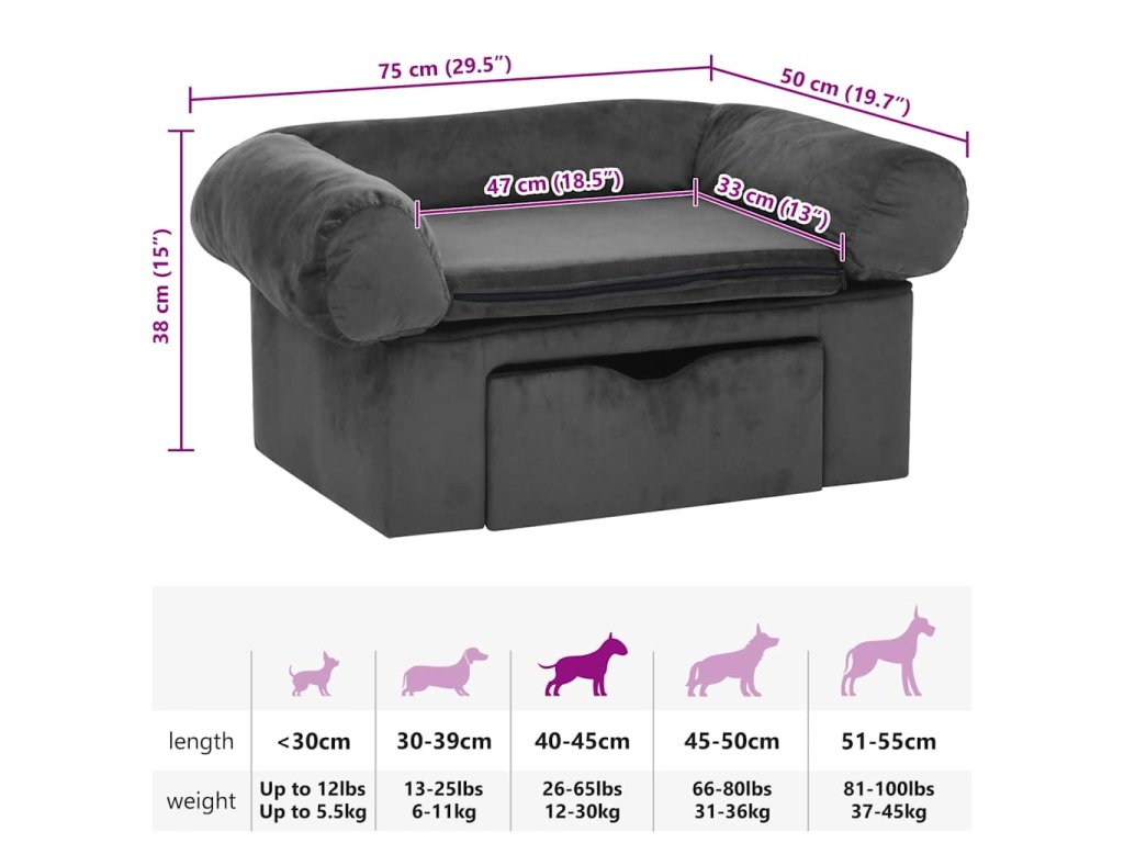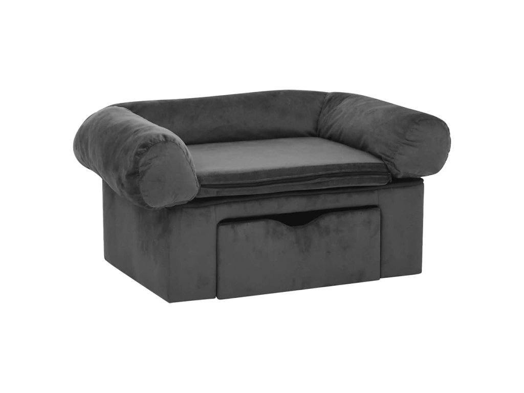 Hustě polstrovaná pohovka pro domácí mazlíčky má dřevěný rám potažený měkkým plyšem, aby se na ní vašim chlupatým kamarádům pohodlně odpočívalo. Ve spodní části najdete zásuvku, kam můžete šikovně uklidit nejrůznější potřeby pro vašeho psa, abyste je měli hezky po ruce. Vnější tělo je také mimořádně odolné, váš pejsek proto může relaxovat v naprostém bezpečí. Potah matrace lze vyprat, aby pohovka zůstala krásně svěží.