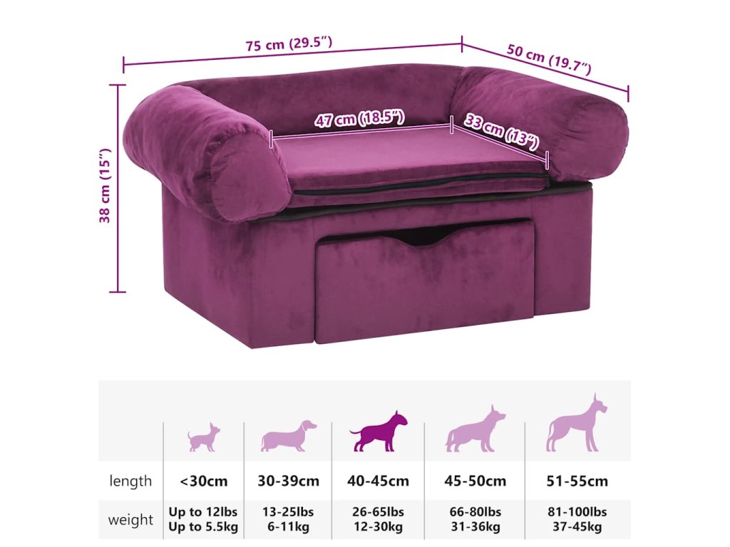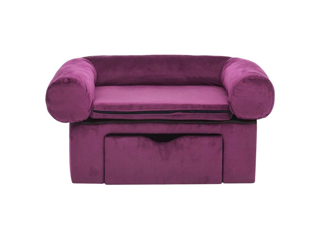 Hustě polstrovaná pohovka pro domácí mazlíčky má dřevěný rám potažený měkkým plyšem, aby se na ní vašim chlupatým kamarádům pohodlně odpočívalo. Ve spodní části najdete zásuvku, kam můžete šikovně uklidit nejrůznější potřeby pro vašeho psa, abyste je měli hezky po ruce. Vnější tělo je také mimořádně odolné, váš pejsek proto může relaxovat v naprostém bezpečí. Potah matrace lze vyprat, aby pohovka zůstala krásně svěží.