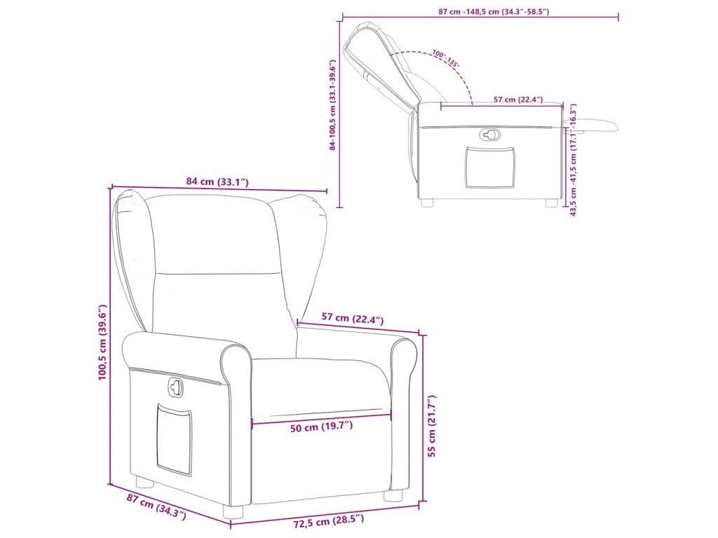- Rozměry sklopeného křesla: 72,5 x 148,5 x 84 cm (Š x H x V)