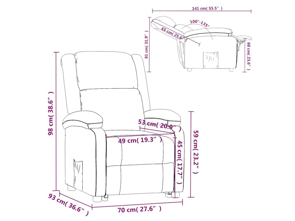 - Rozměry při poloze vsedě: 70 x 93 x 98 cm (Š x H x V)