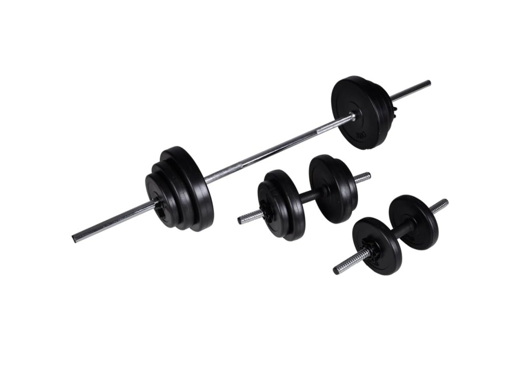 Sada činek barbell a dumbbell obsahuje silné pochromované činkové tyče s rychloupínacími pružinovými objímkami (pro tyč barbell), neklouzavé rukojeti a vroubkované hvězdicové uzávěry (pro tyče dumbbell), které zajišťují bezpečné upevnění zátěžových kotoučů. Můžete tak cvičit bez obav o vaše bezpečí. Zátěžové kotouče jsou vyrobeny s robustním vrchním pláštěm z polyetylenu. Dají se kombinovat různými způsoby tak, aby vyhovovaly různým tréninkovým účelům.