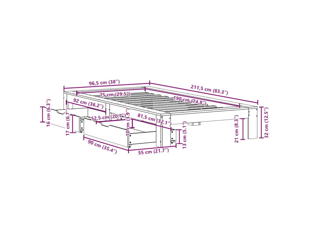 - Rozměry: 211,5 x 96,5 x 32 cm (D x Š x V)