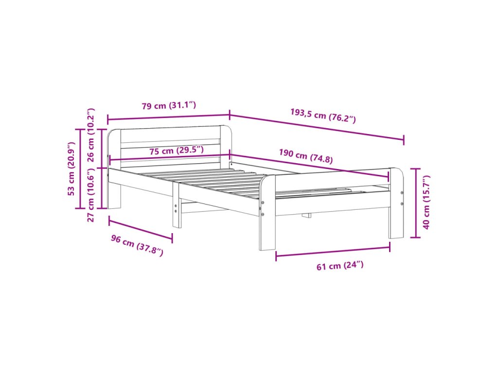 - Celkové rozměry postele: 193,5 x 79 x 53 cm (D x Š x V)