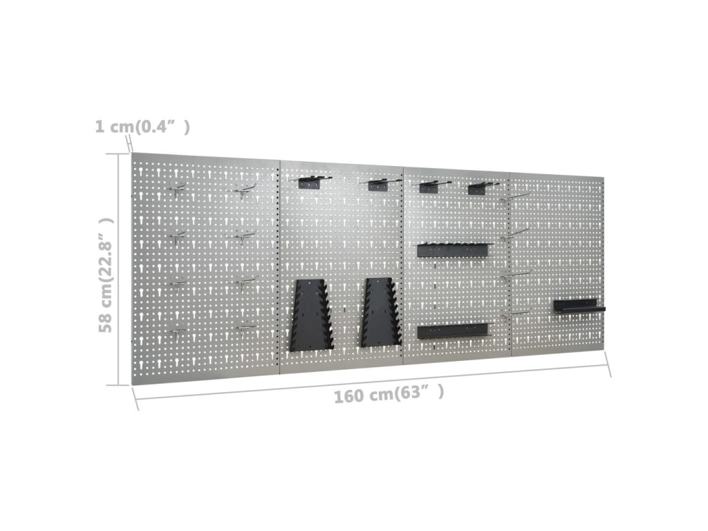 Tyto panely do dílny na nářadí jsou vyrobené z masivní oceli a unesou váhu celé řady různých nástrojů, jako jsou vrtačky, kleště, šroubováky a klíče. Panely jsou děrované pro snadné a bezpečné zavěšení nástrojů. Tyto 4 nástěnné panely je možné spojit dohromady a vytvořit jeden velmi pevný celek. Je to ideální doplněk ponků a dílenských skříní s praktickou šířkou 160 cm.