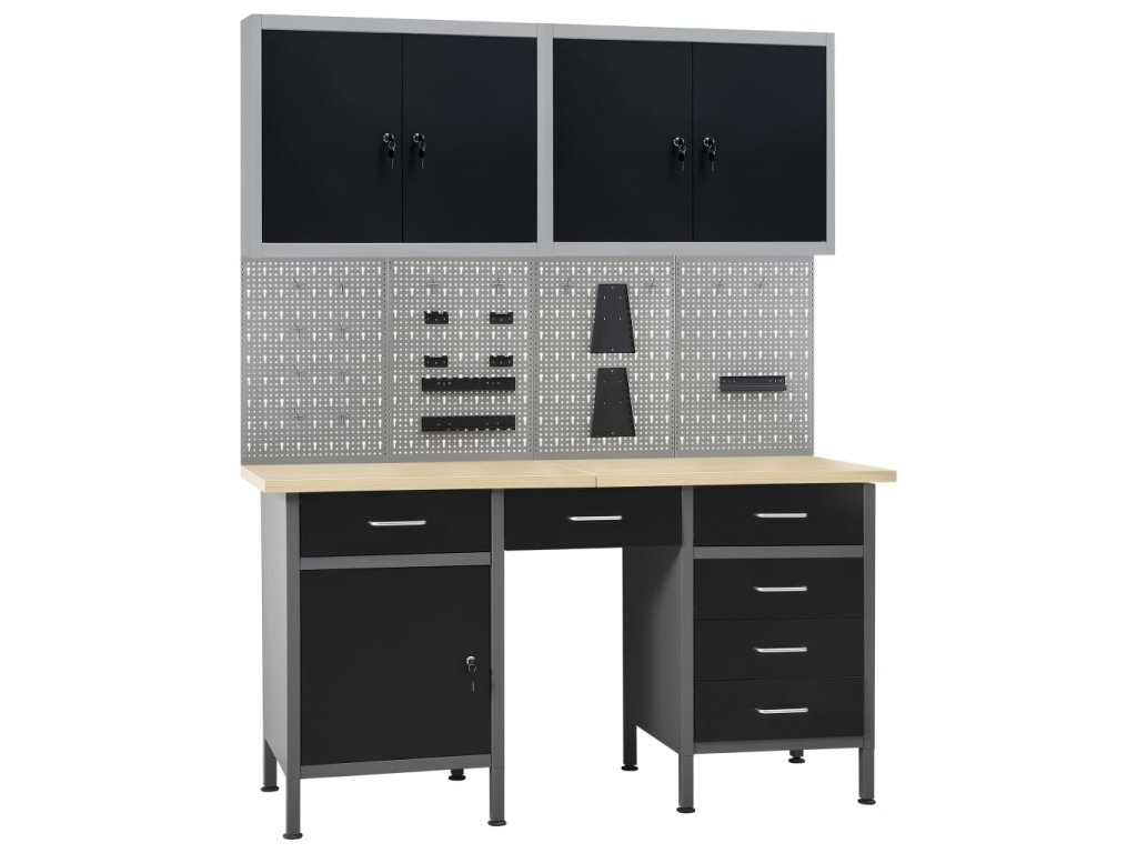 Tato dílenská sada 1 pracovního stolu se 4 nástěnnými panely a 2 nástěnnými skříňkami je praktické úložné řešení pro vaši dílnu a garáž.