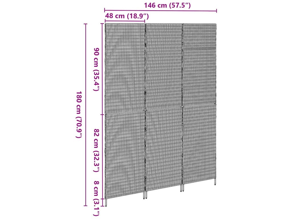 Tato přepážka v šedém ratanu s pevným ocelovým rámem je lehká, ale pevná, takže ji můžeš snadno přenášet a přestavovat podle potřeby. Vhodná jak do interiéru, tak exteriéru.- Barva: Šedá