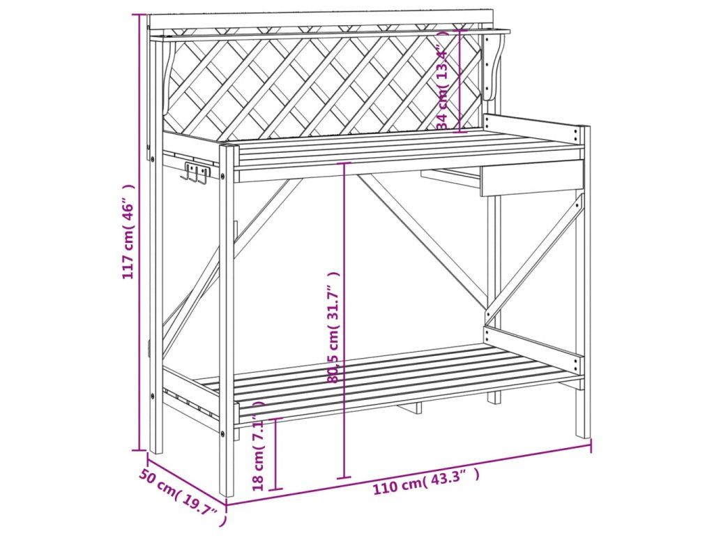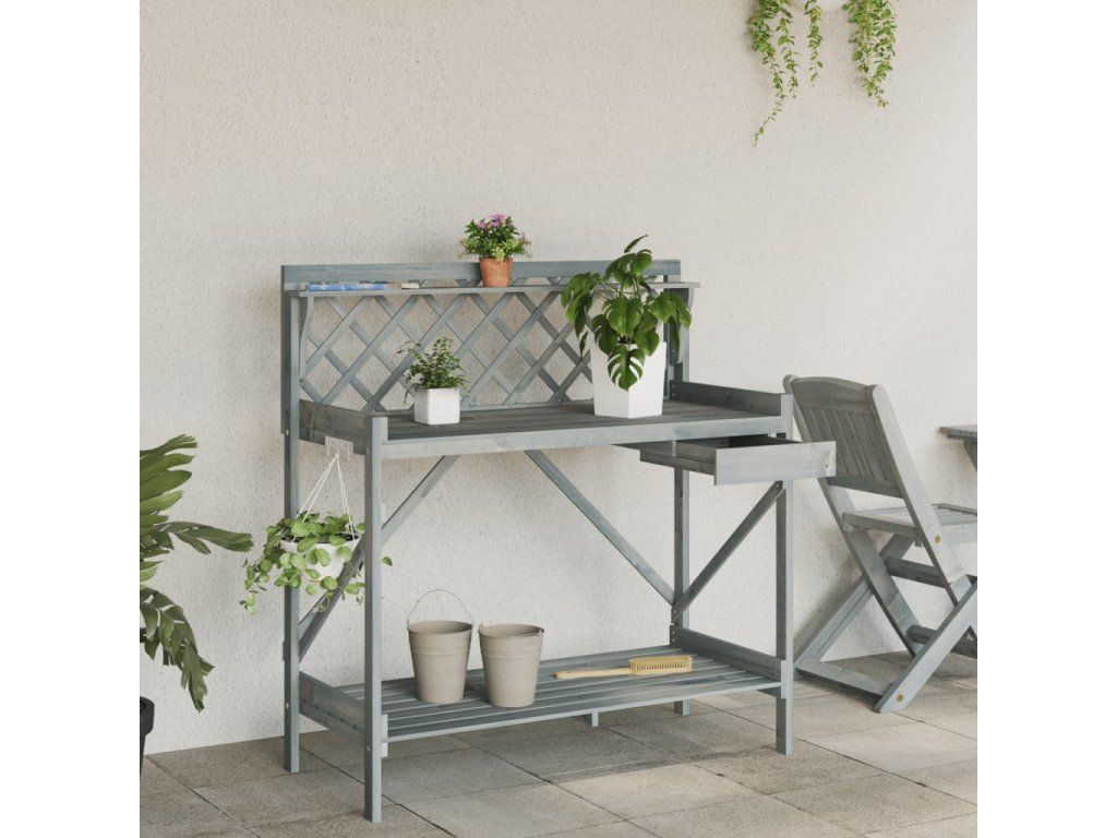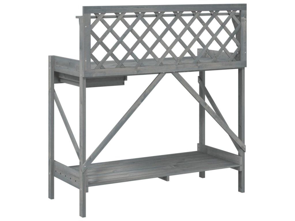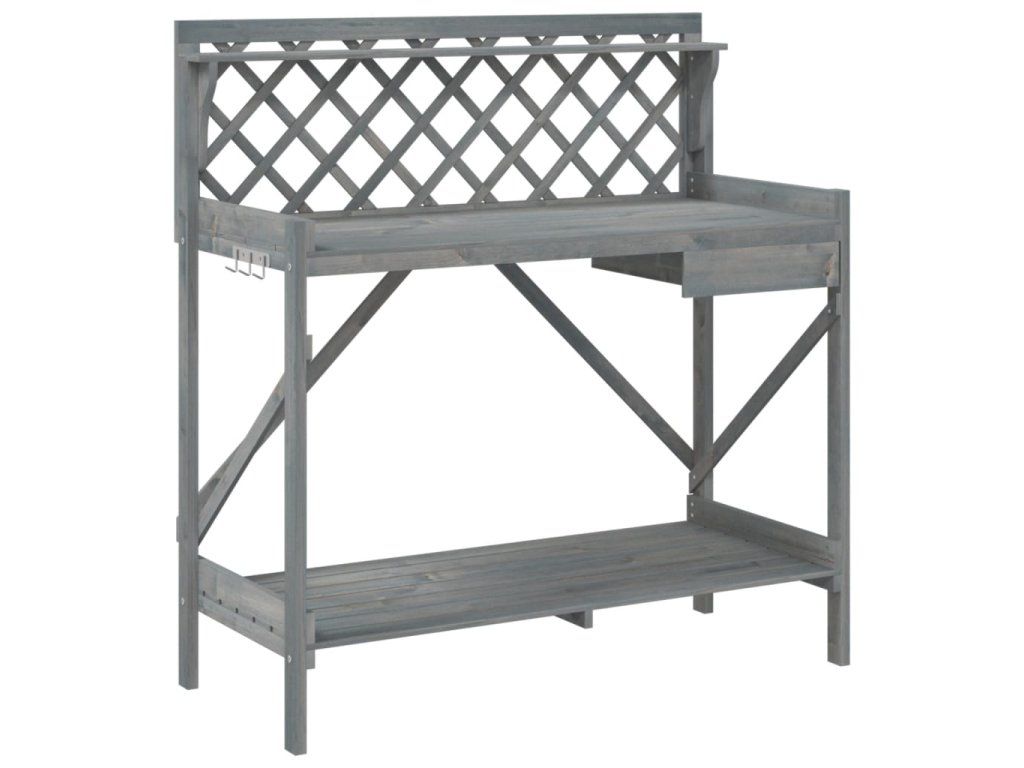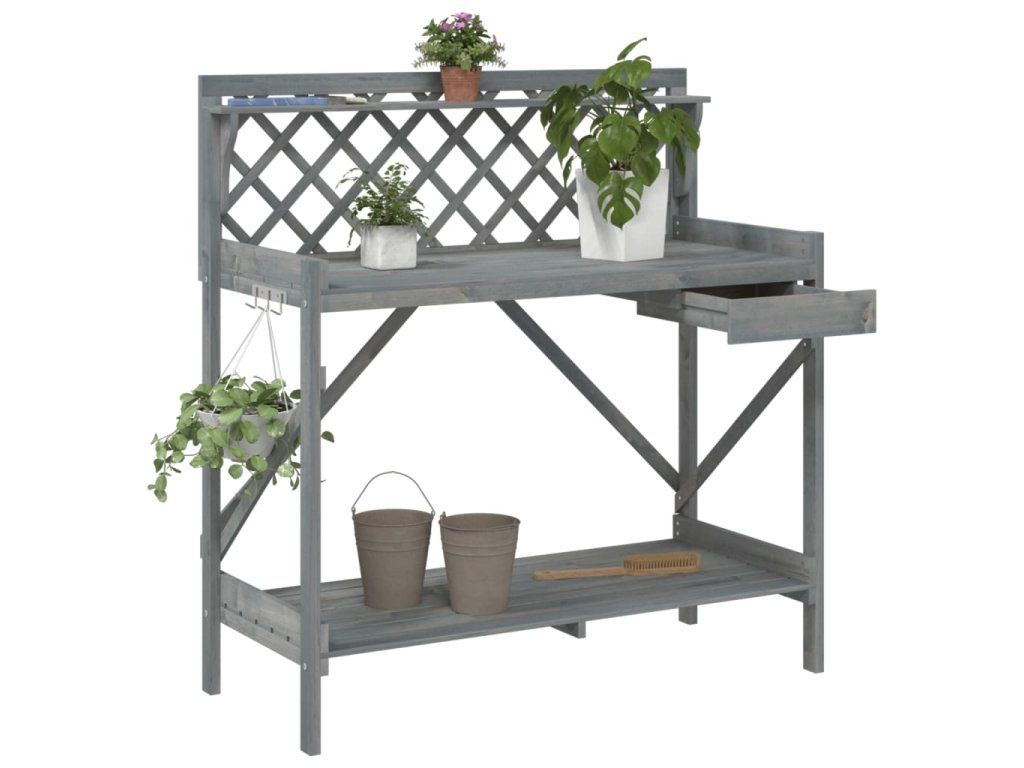 - Dekorace: Přesazovací stůl je opatřen treláží, která poskytuje prostor pro pěstování popínavých rostlin směrem vzhůru. Treláž s diamantovým vzorem je také vhodná pro zavěšení rostlin v koších nebo dekorací, které zkrášlí vaši zahradu.