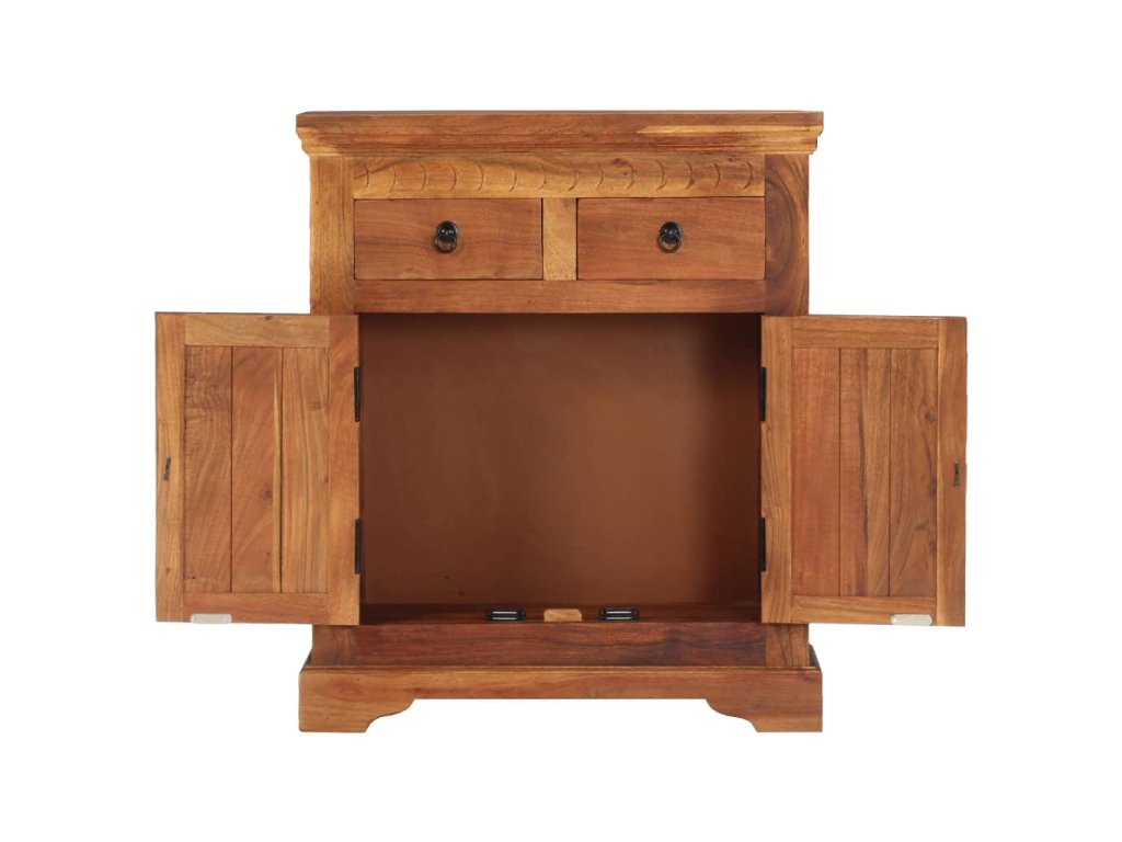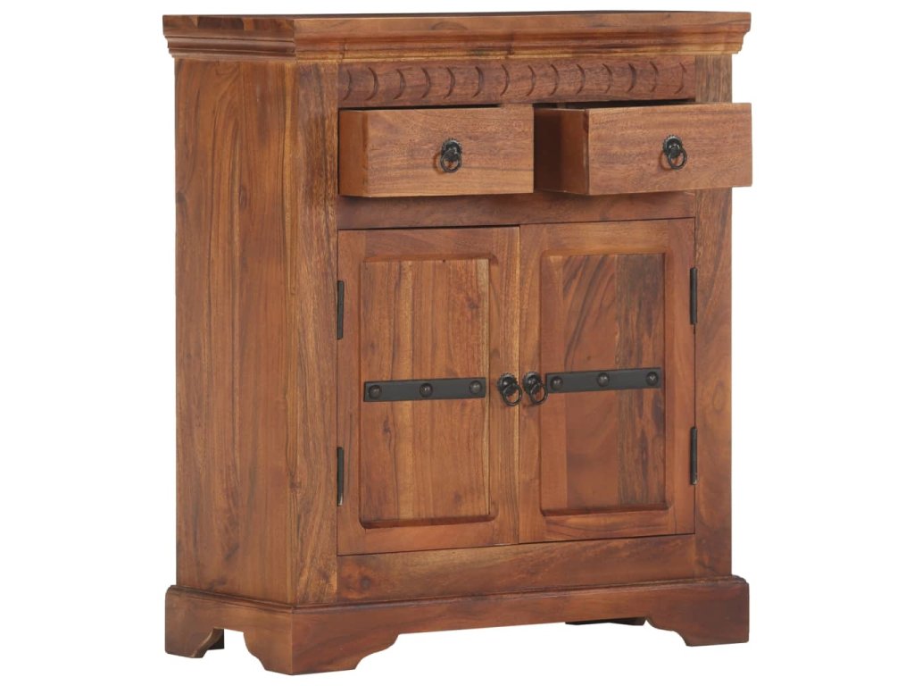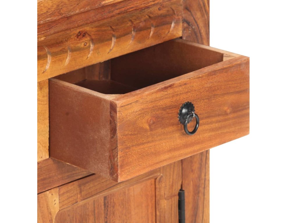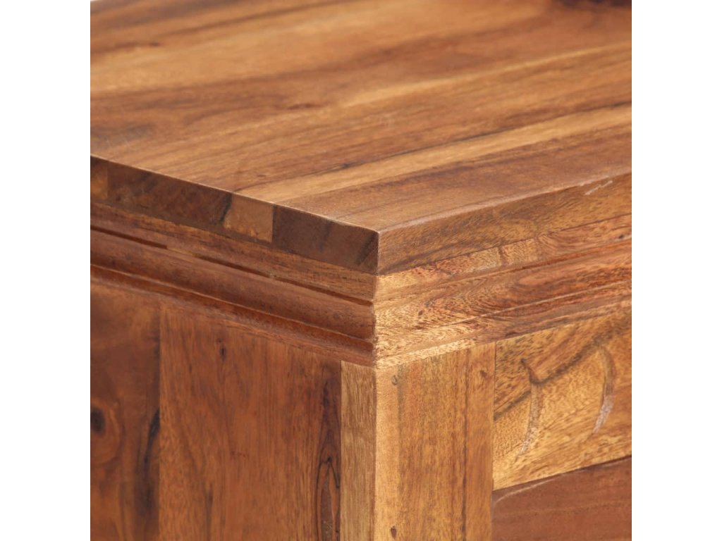 Příborník je vyroben z masivní akácie, což je vysoce stabilní a odolné tvrdé dřevo. Pevná horní deska se skvěle hodí k vystavení dekorativních předmětů, jako jsou vázy či květináče. Skříňka vám poskytne spoustu úložného prostoru pro přehledné uspořádání nejrůznějších věcí. Originální dekorativní vzory umocňují její moderní šarm. Není třeba nic sestavovat.