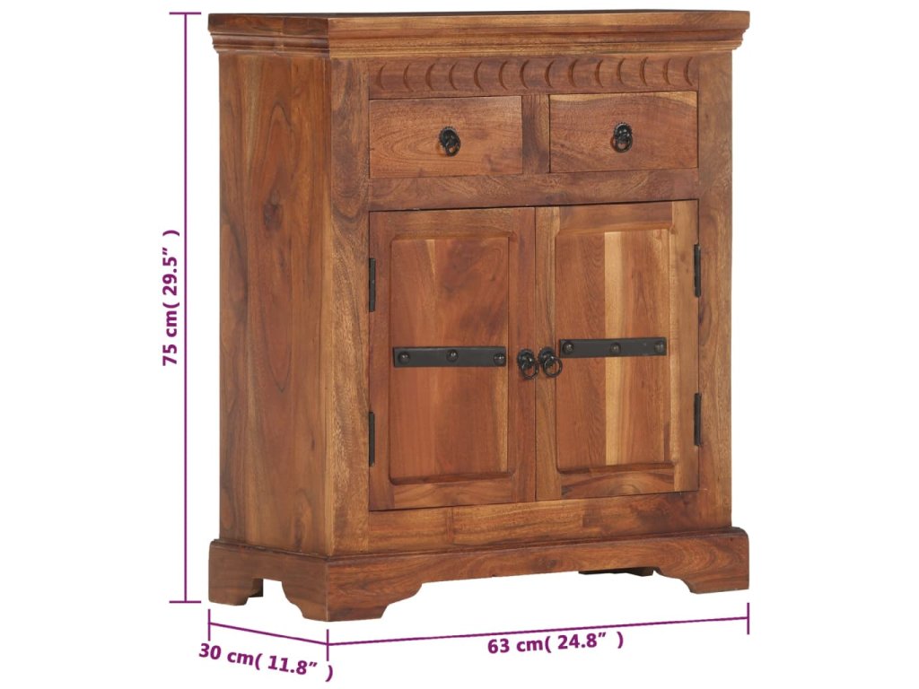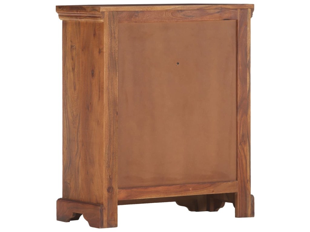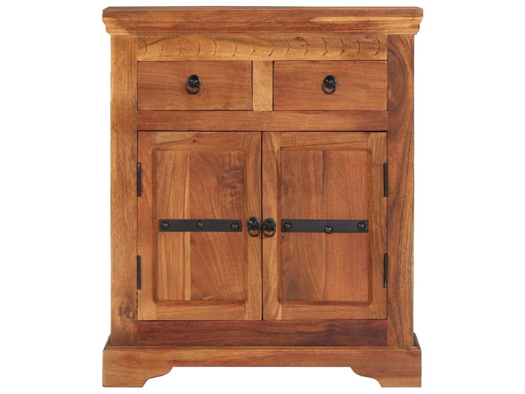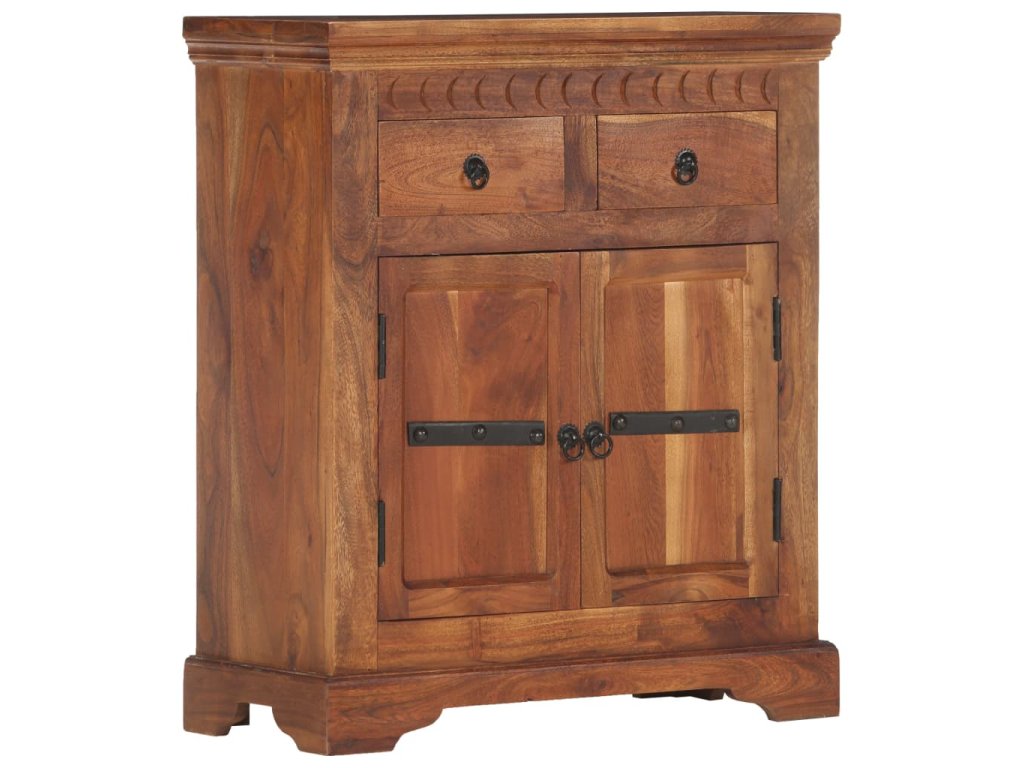 Příborník je vyroben z masivní akácie, což je vysoce stabilní a odolné tvrdé dřevo. Pevná horní deska se skvěle hodí k vystavení dekorativních předmětů, jako jsou vázy či květináče. Skříňka vám poskytne spoustu úložného prostoru pro přehledné uspořádání nejrůznějších věcí. Originální dekorativní vzory umocňují její moderní šarm. Není třeba nic sestavovat.