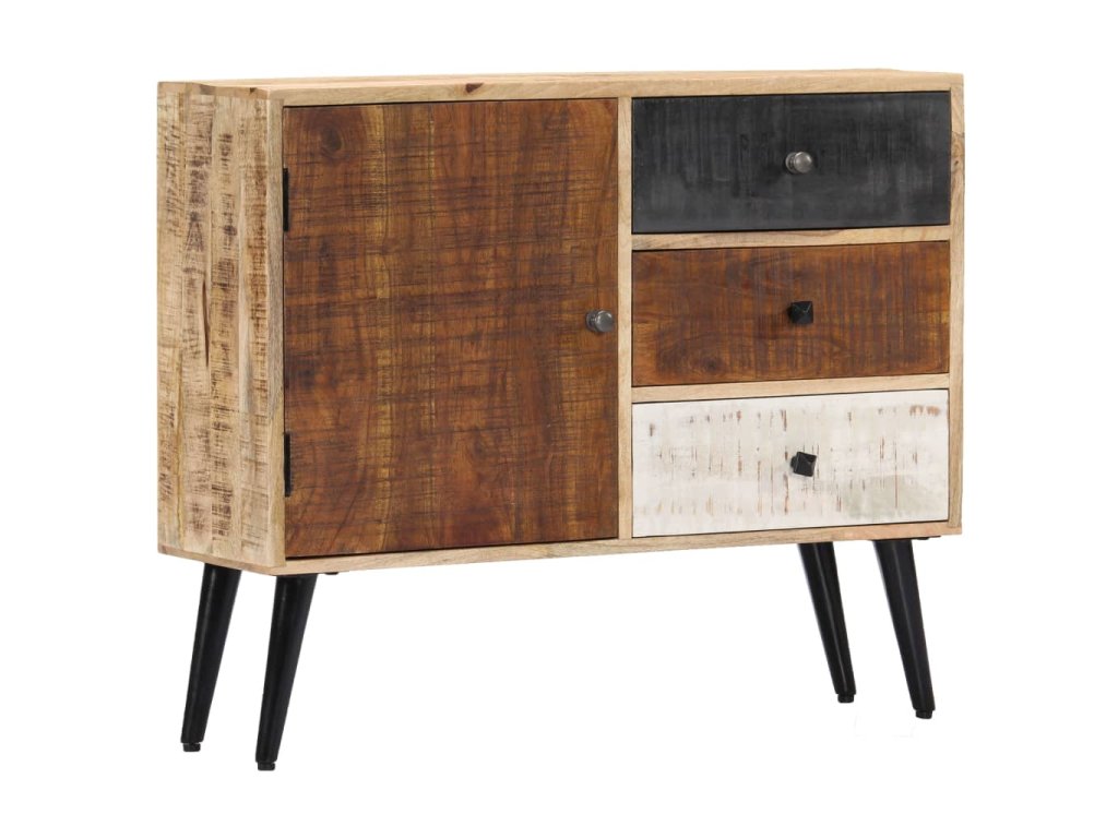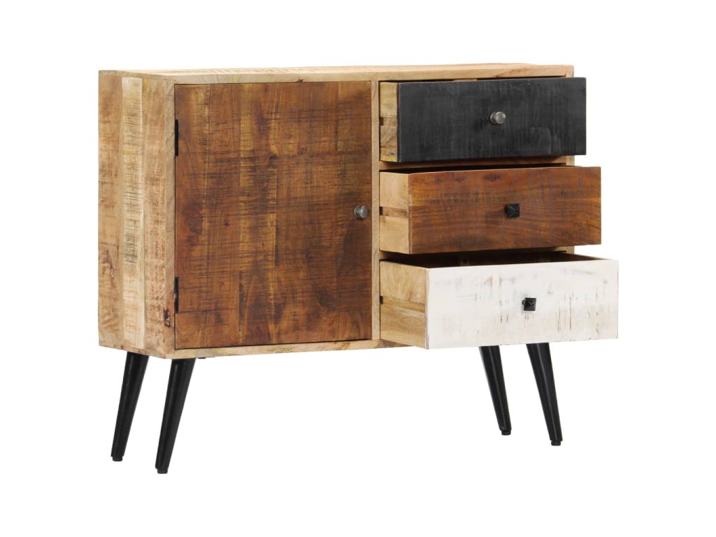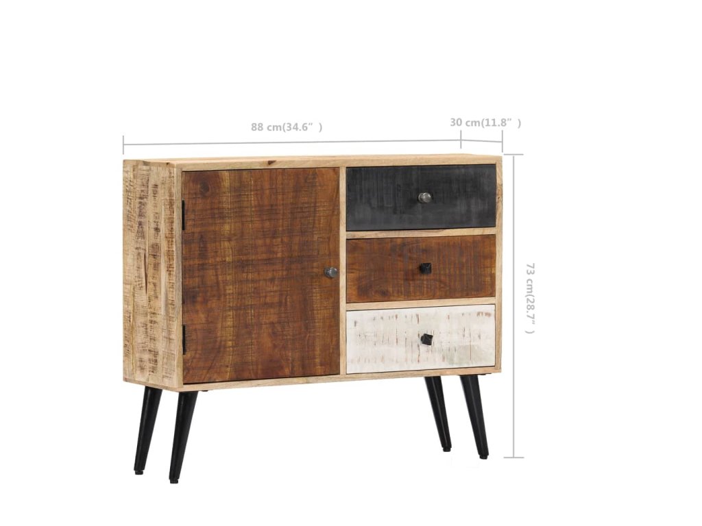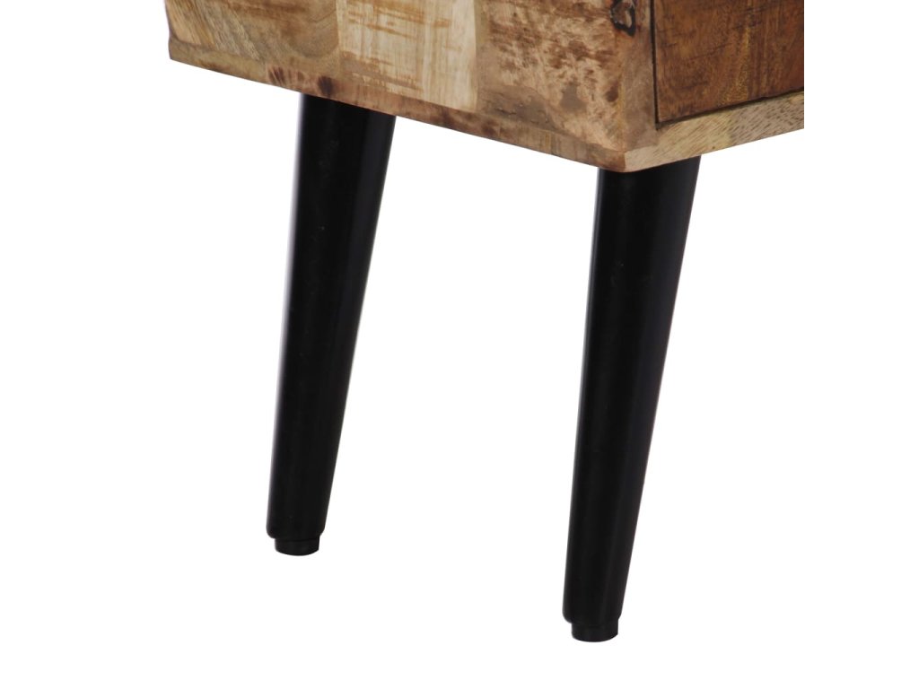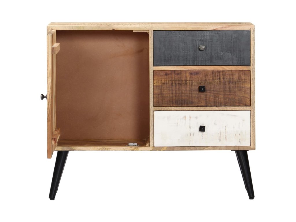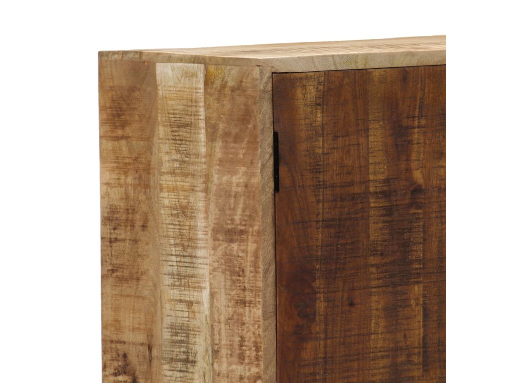 Příborník je vyrobený z masivního mangovníkového dřeva a byl naleštěný, natřený a nalakovaný, aby vynikl jeho půvabný a rafinovaný vzhled. Mangovník má husté a robustní tvrdé dřevo, jehož povrch je typický svými hnědými či zlatými pruhy a liniemi. Krásu stolku umocňují také tři zásuvky a přihrádka s dvířky, které vám poskytnou spoustu úložného prostoru, kde si můžete přehledně uspořádat boty, knížky a další různé maličkosti tak, abyste je měli po ruce. Sestavení příborníku je jednoduché a k jeho čištění vám postačí navlhčený hadřík.