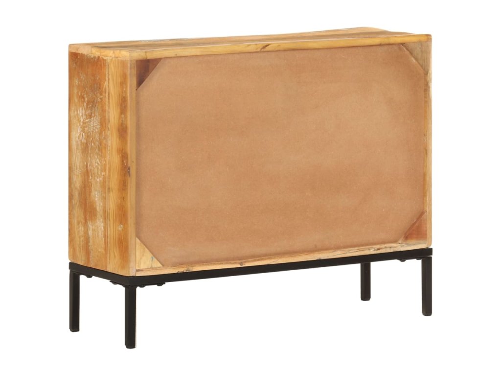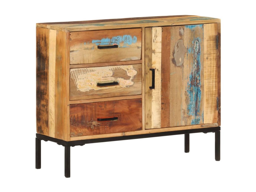 Tato skříňka je vyrobena z masivního recyklovaného dřeva, které pochází z trámů, nosných trámů a podlah ze starých a zbouraných budov. Jedná se tedy o ekologicky šetrný způsob výroby nábytku. Směs recyklovaného dřeva zahrnuje borovici, týk, buk, mangovník atd. To znamená, že regenerovaný materiál si zachovává vlastnosti těchto různých druhů dřeva. Železný rám s práškovým nástřikem dodává nábytku větší stabilitu. Boční skříňka je vybavena 3 zásuvkami a 1 dvířky, díky kterým budou knihy, časopisy a další předměty dobře uspořádané a váš pokoj zůstane uklizený. Horní robustní deska je navíc ideální pro vystavení dekorativních předmětů, rámečků na fotografie nebo květináčů.