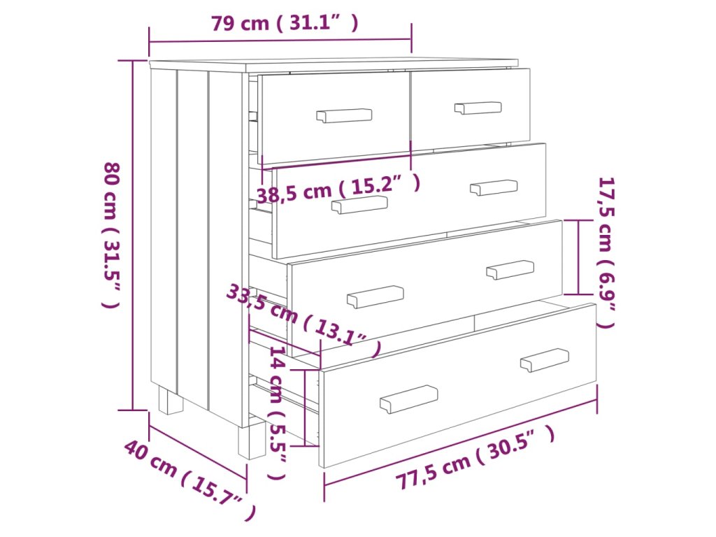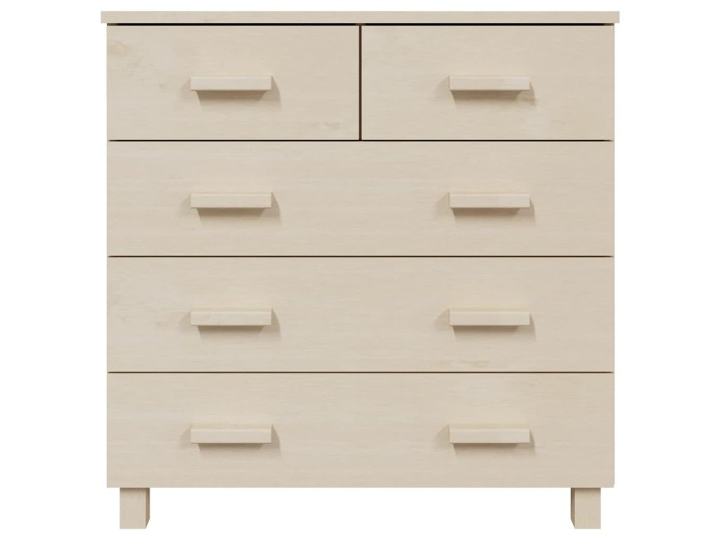 Komoda je vyrobená z masivního borového dřeva, takže je stabilní a odolná. Příborník obsahuje 5 hladce výsuvných zásuvek, které vám poskytnou spoustu prostoru pro přehledné uložení různých každodenních nezbytností. Robustní stolní deska je navíc ideální pro vystavení dekorativních předmětů, fotorámečků a pokojových rostlin.