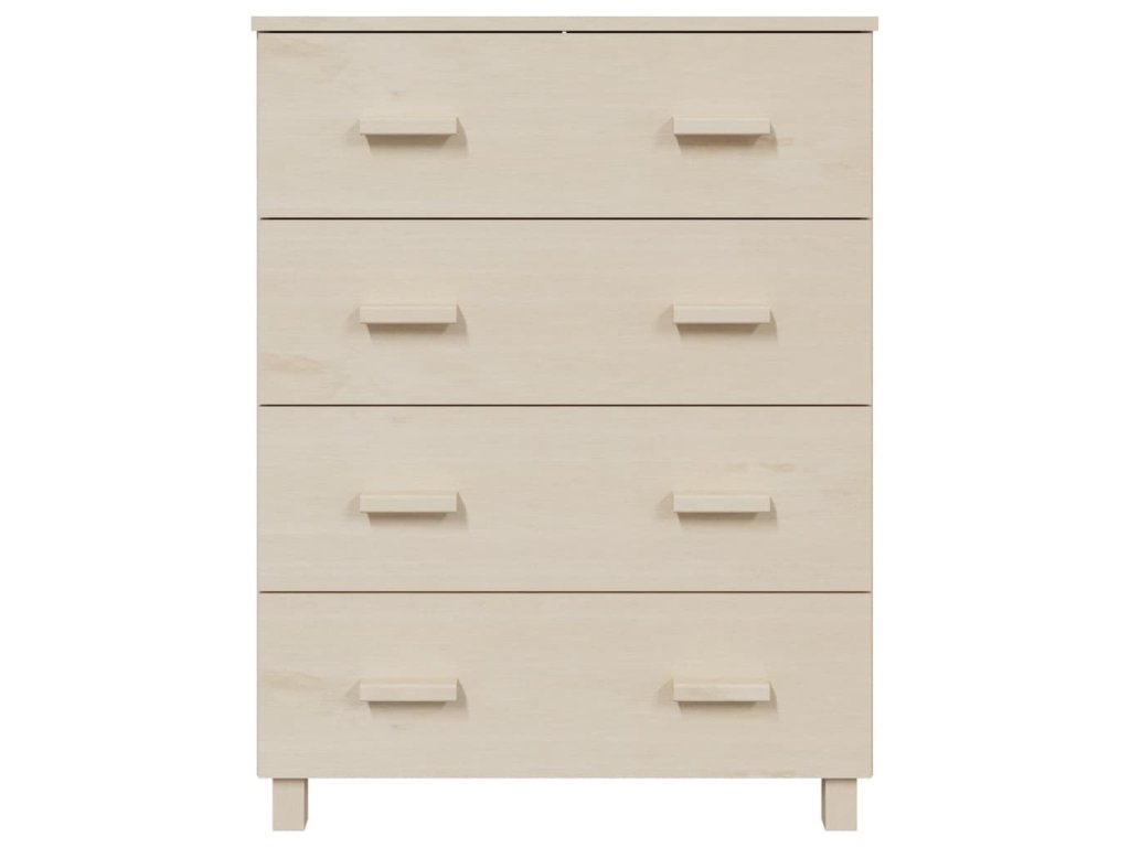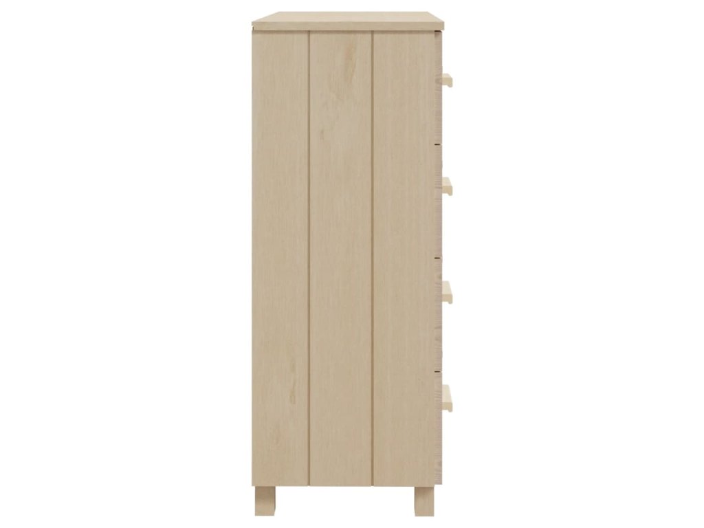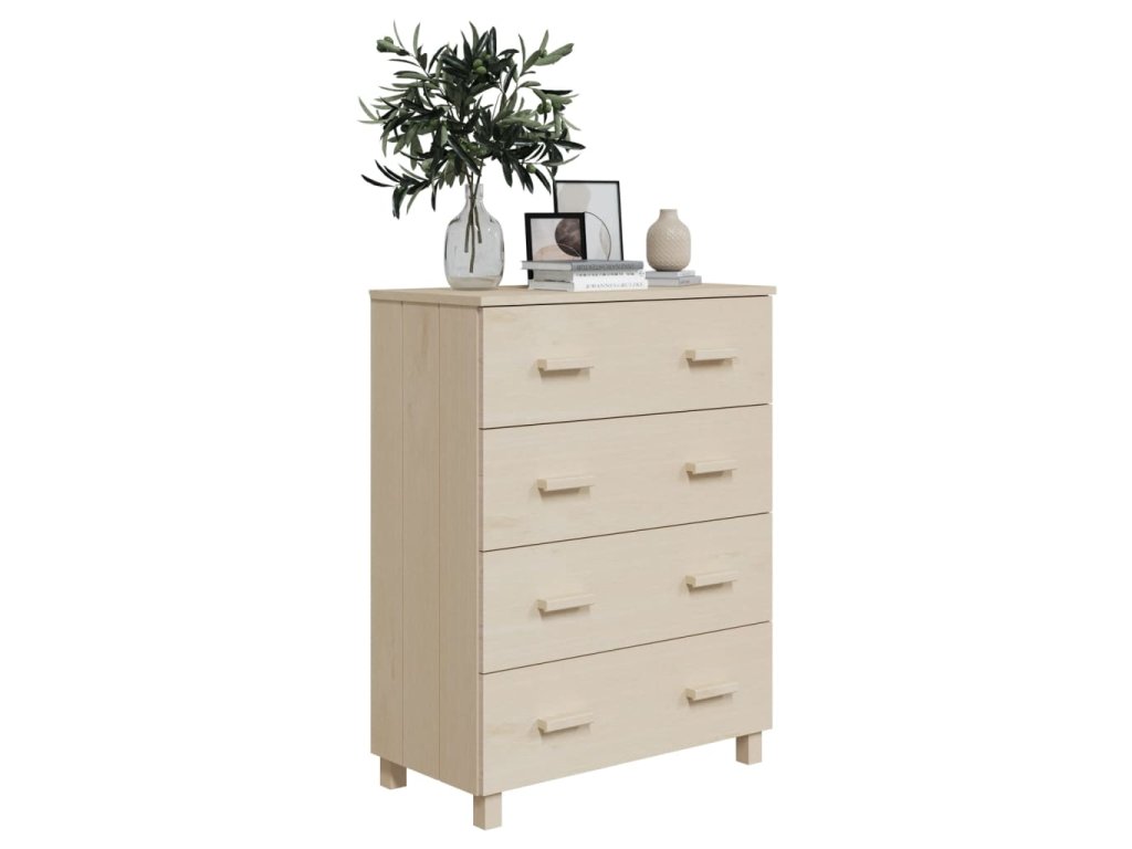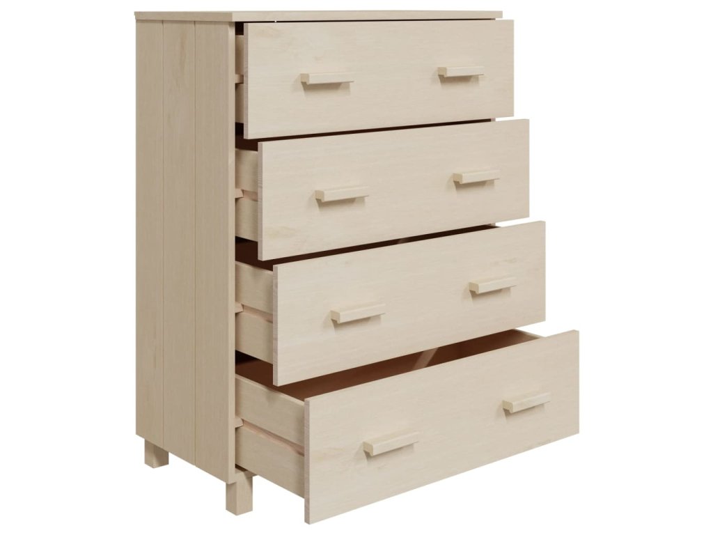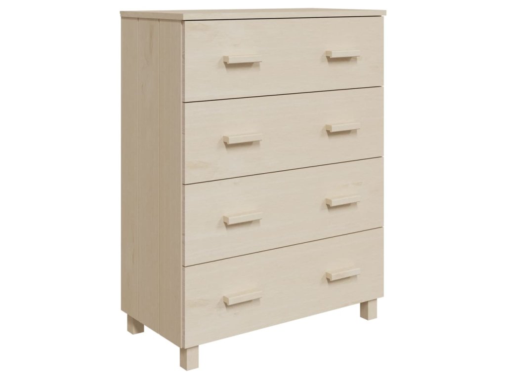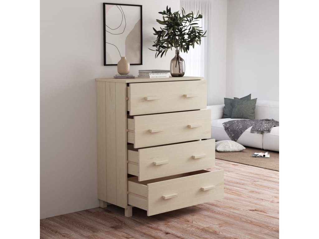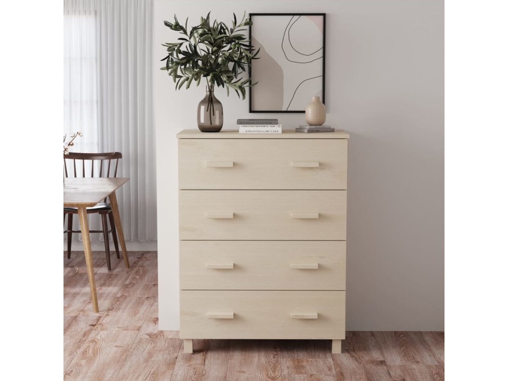 Komoda je vyrobená z masivního borového dřeva, takže je stabilní a odolná. Příborník obsahuje 4 hladce výsuvné zásuvky, které vám poskytnou spoustu prostoru pro přehledné uložení různých každodenních nezbytností. Robustní stolní deska je navíc ideální pro vystavení dekorativních předmětů, fotorámečků a pokojových rostlin.
