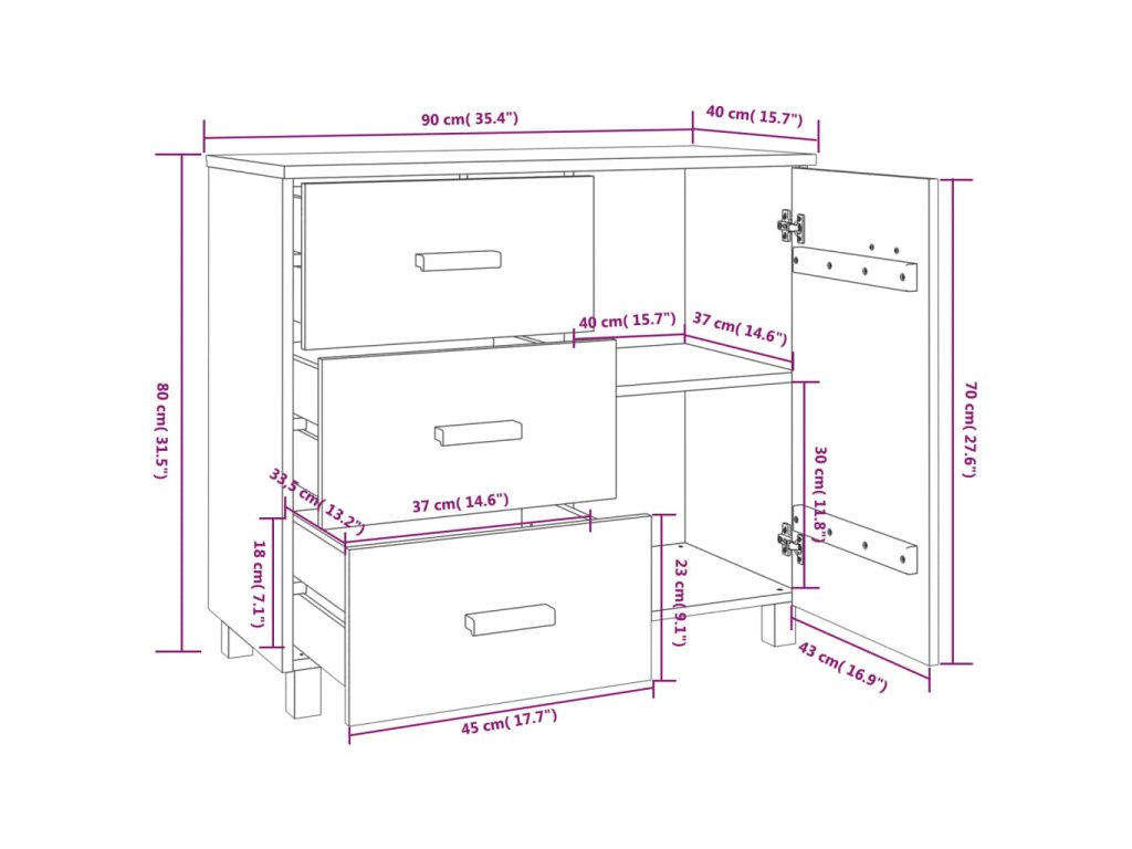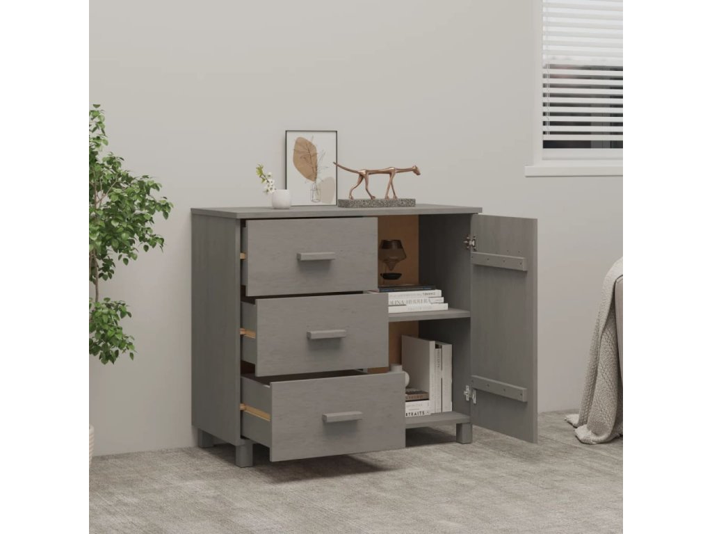 Zásuvková skříň je vyrobena z masivního borového dřeva, takže je stabilní a odolná. Příborník má 1 dvířka a 3 hladké posuvné zásuvky, které poskytují dostatek úložného prostoru pro přehledné uložení různých každodenních nezbytností. Robustní stolní deska je navíc ideální pro vystavení dekorativních předmětů, fotorámečků a rostlin v květináčích.