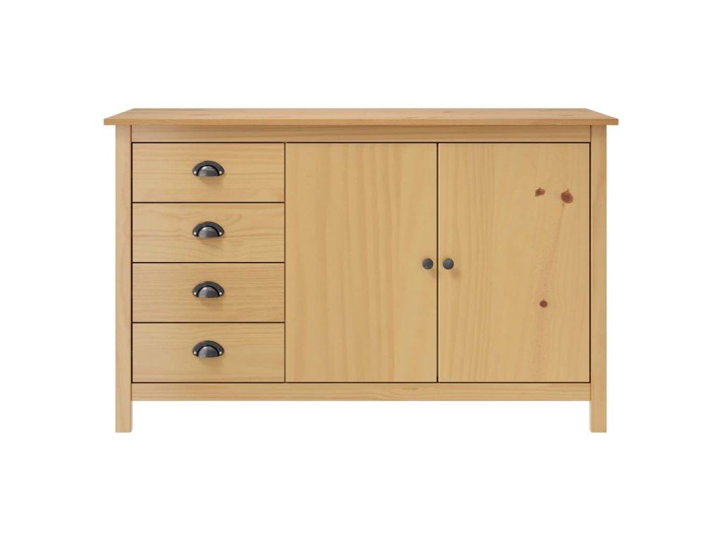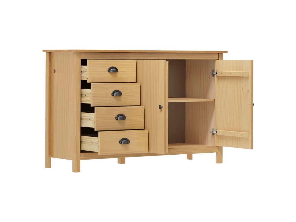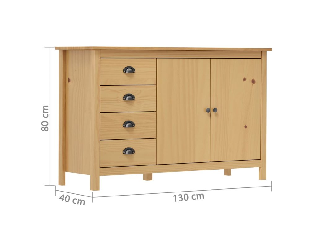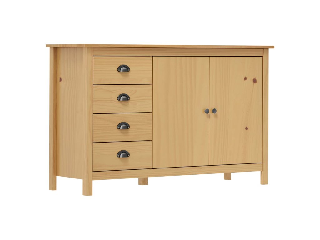 Tato odkládací skříňka je zhotovená z masivního borového dřeva, je tedy stabilní a bytelná. Skříňka je vybavena 2 dvířky a 4 prostornými zásuvkami s úchytkami ve tvaru mušlí, poskytne vám tedy dostatek úložného prostoru pro všechny vaše předměty, které chcete mít přehledně uspořádané a vždy po ruce.