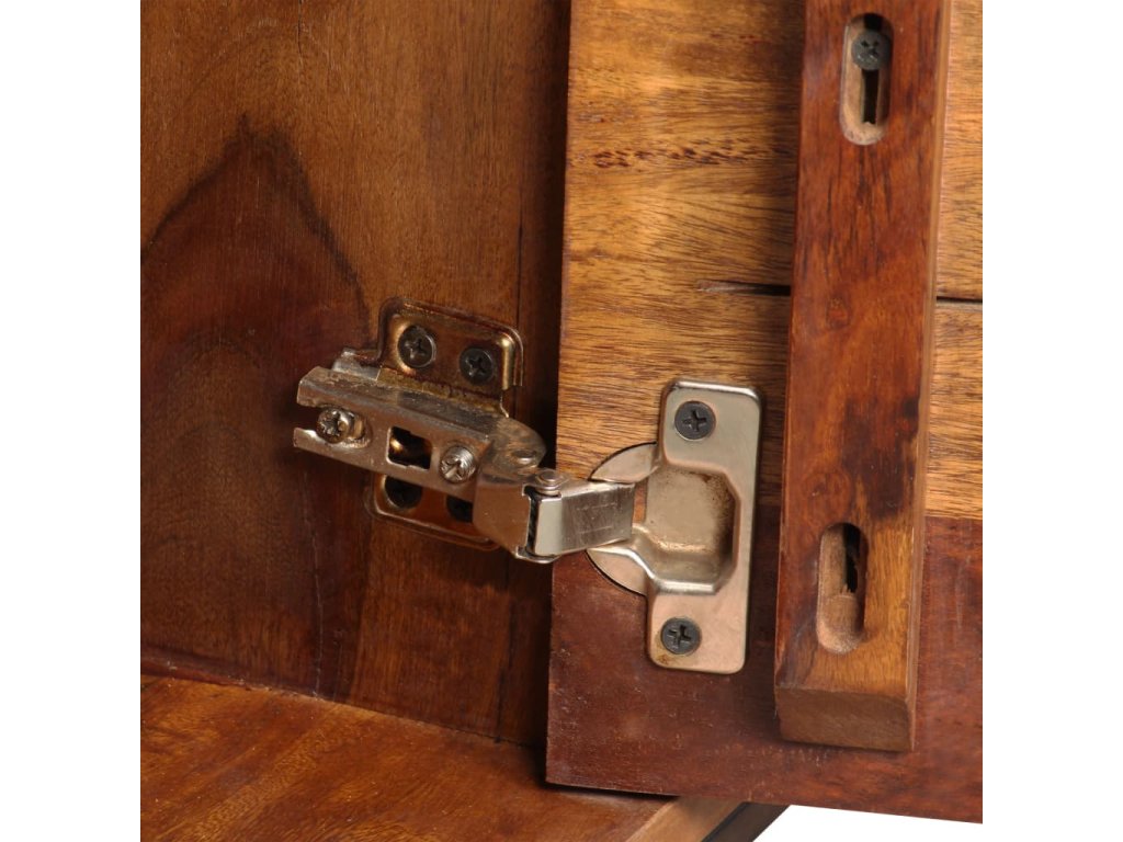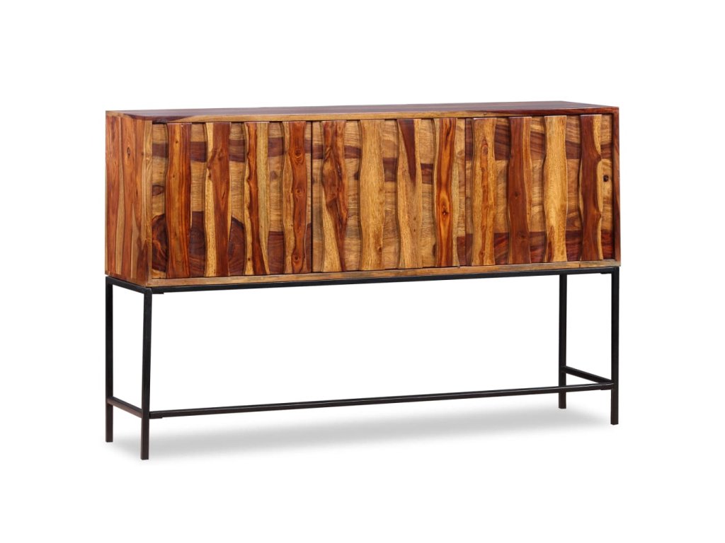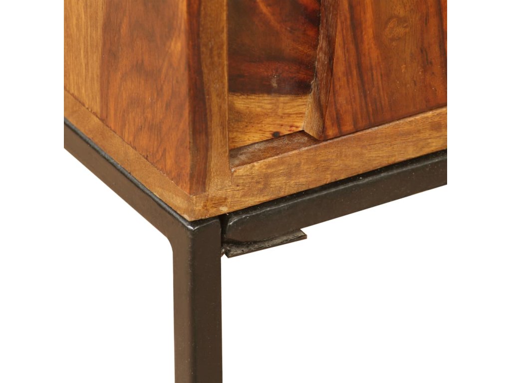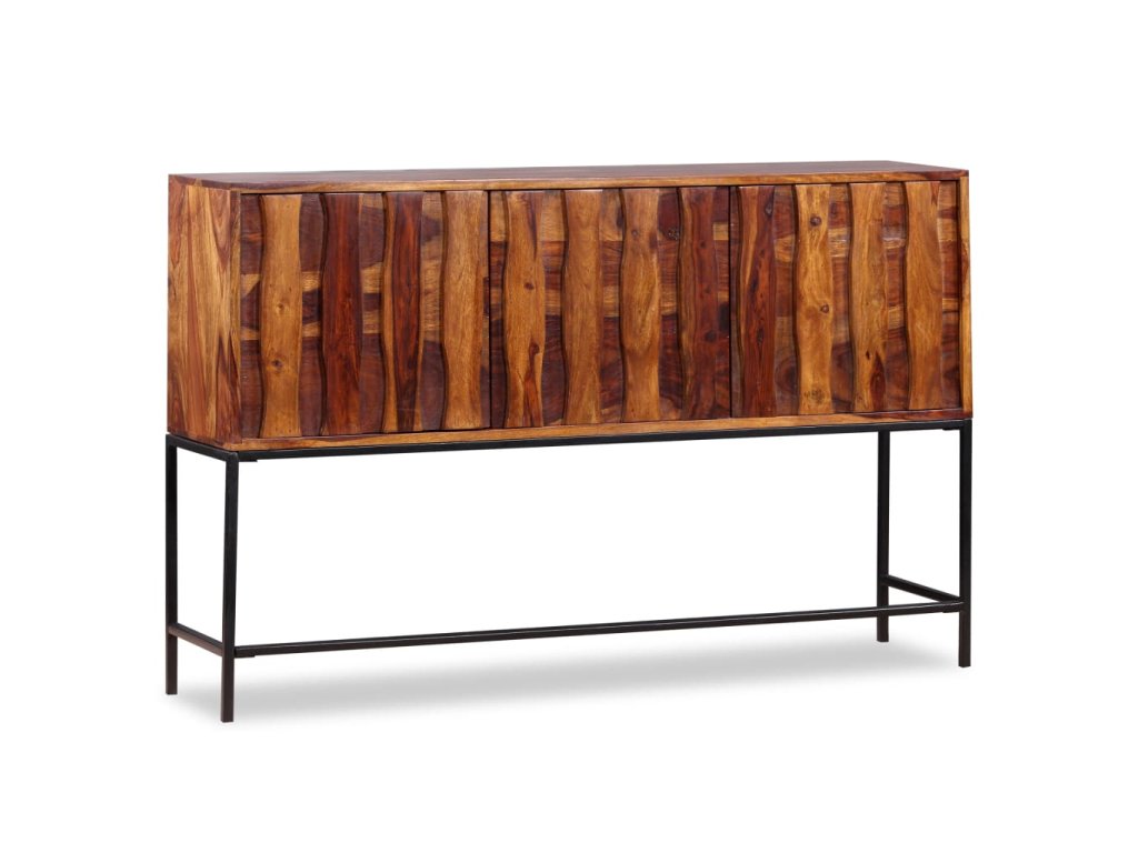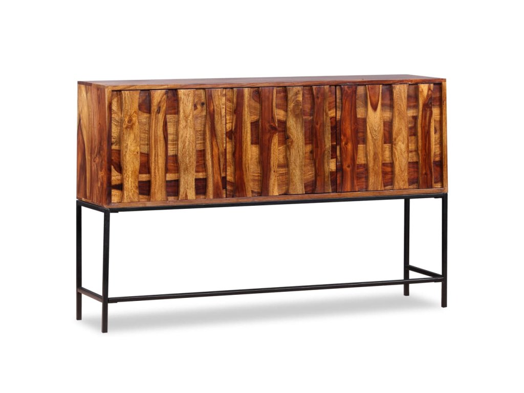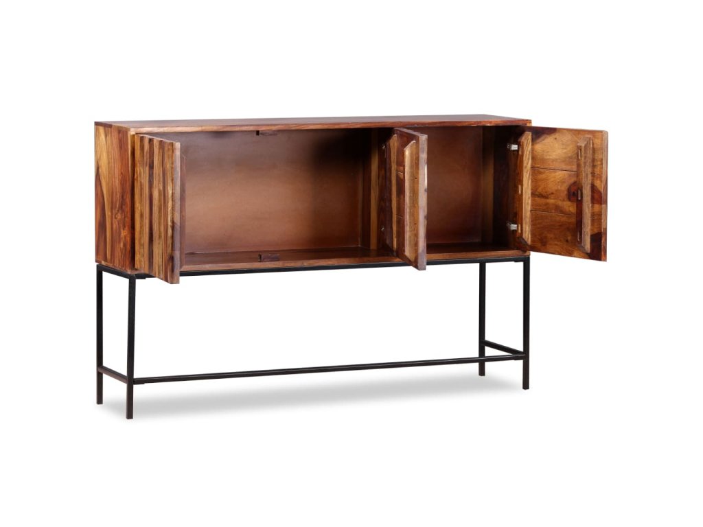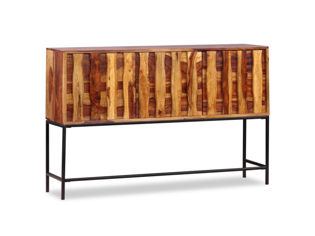 Tato komoda je vyrobena ze sheeshamového masivu. Sheesham, také známý jako palisandr či růžové dřevo, je tvrdé dřevo z tropů, které je proslavené svými zrny. Komoda se pyšní pevnou deskou, na níž lze vystavit mísu s ovocem, vázu či jiné dekorativní předměty. Pevné nožky z tepaného železa jí pak dodávají na stabilitě. Komoda disponuje skříňkami, do kterých se vejdou veškeré vaše drobnosti, které si chcete uschovat po ruce. Celá komoda je ručně vyráběná, což v kombinaci s krásnými zrny činí každý kousek jedinečným a lehce odlišným od všech ostatních.