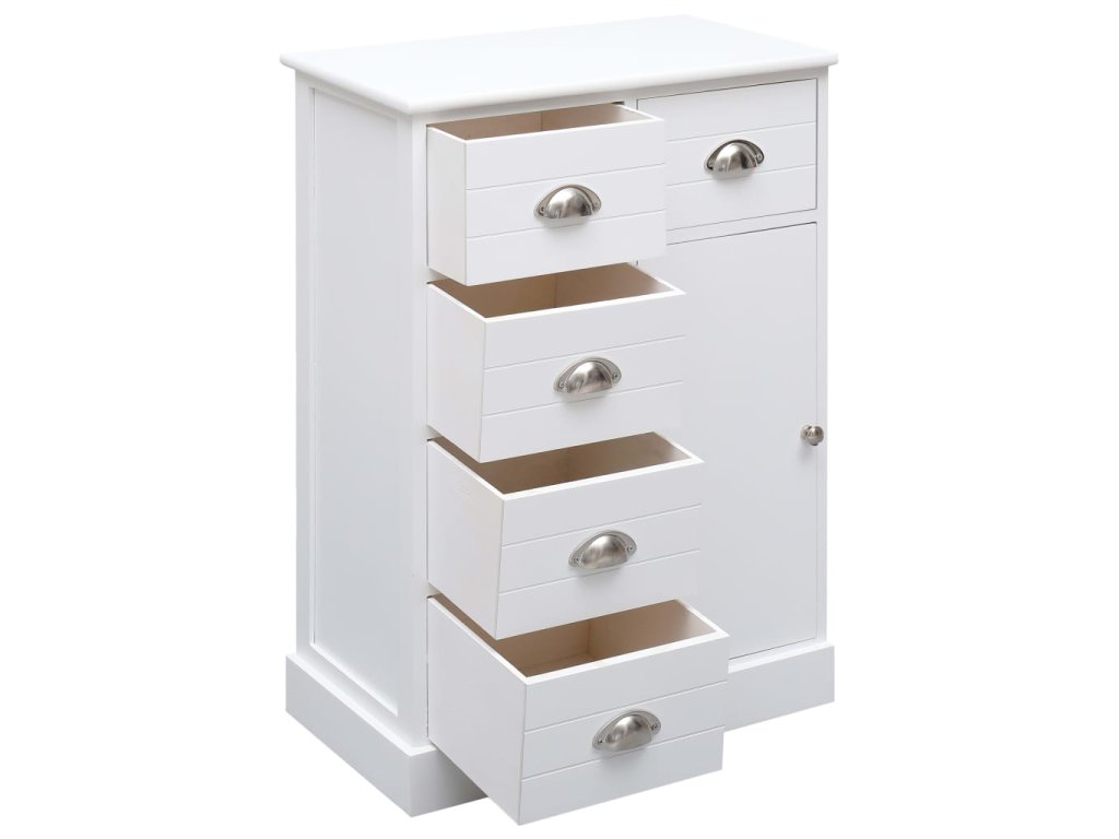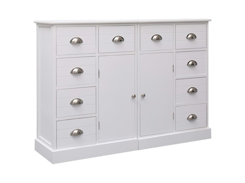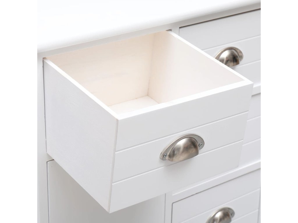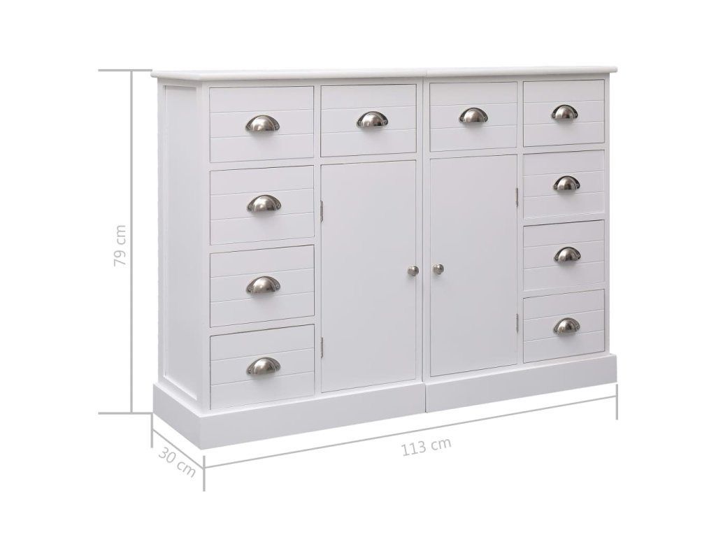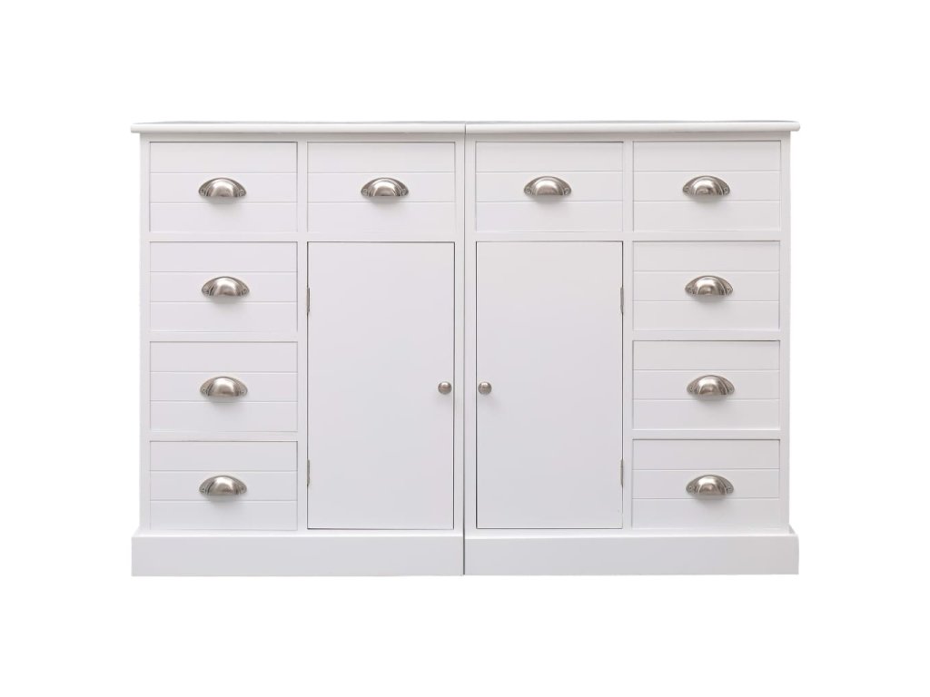 Tento příborník je vyroben z kvalitního dřeva pavlovnie a topolu a MDF desky, je tedy mimořádně robustní a má dlouhou životnost. V 10 zásuvkách a 2 skříňkách najdete spoustu místa, kde si můžete přehledně uspořádat celou řadu různých věcí, jako jsou klíče, poznámkové bloky, knížky, časopisy nebo jiné drobnosti a nezbytnosti. Prostorná horní deska se navíc skvěle hodí pro umístění multimediálních spotřebičů nebo pro vystavení dekorativních předmětů. Příborníky můžete buď zkombinovat dohromady, nebo je použít odděleně jako dvě samostatné skříňky.
