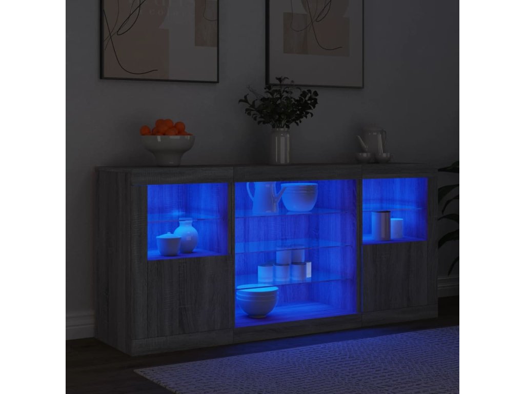 - RGB LED světla: Skříňka je vybavena zářivými RGB LED světly. Různé přizpůsobitelné nabídky vám umožní snadno změnit barvu světel nebo dokonce i nastavit světla tak, aby se přizpůsobila automaticky. Tato LED světla nejen podtrhují moderní vzhled příborníku, ale také mu dodávají na módním půvabu.