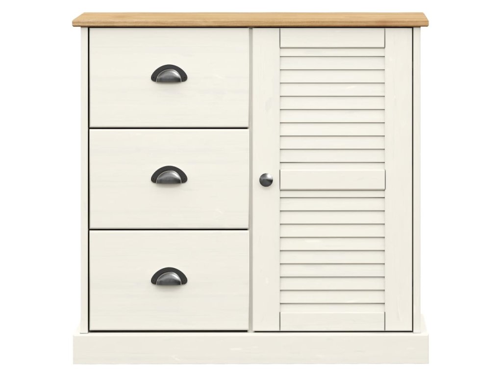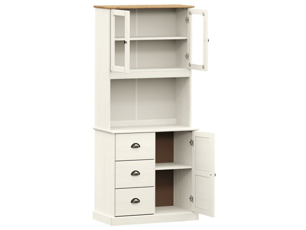 - Masivní borové dřevo: Masivní borové dřevo je krásný přírodní materiál. Borové dřevo má rovnou kresbu a obsahuje suky, které materiálu dodávají jeho charakteristický, rustikální vzhled. Příborník je vyroben z masivního borového dřeva, je tedy odolný a robustní.