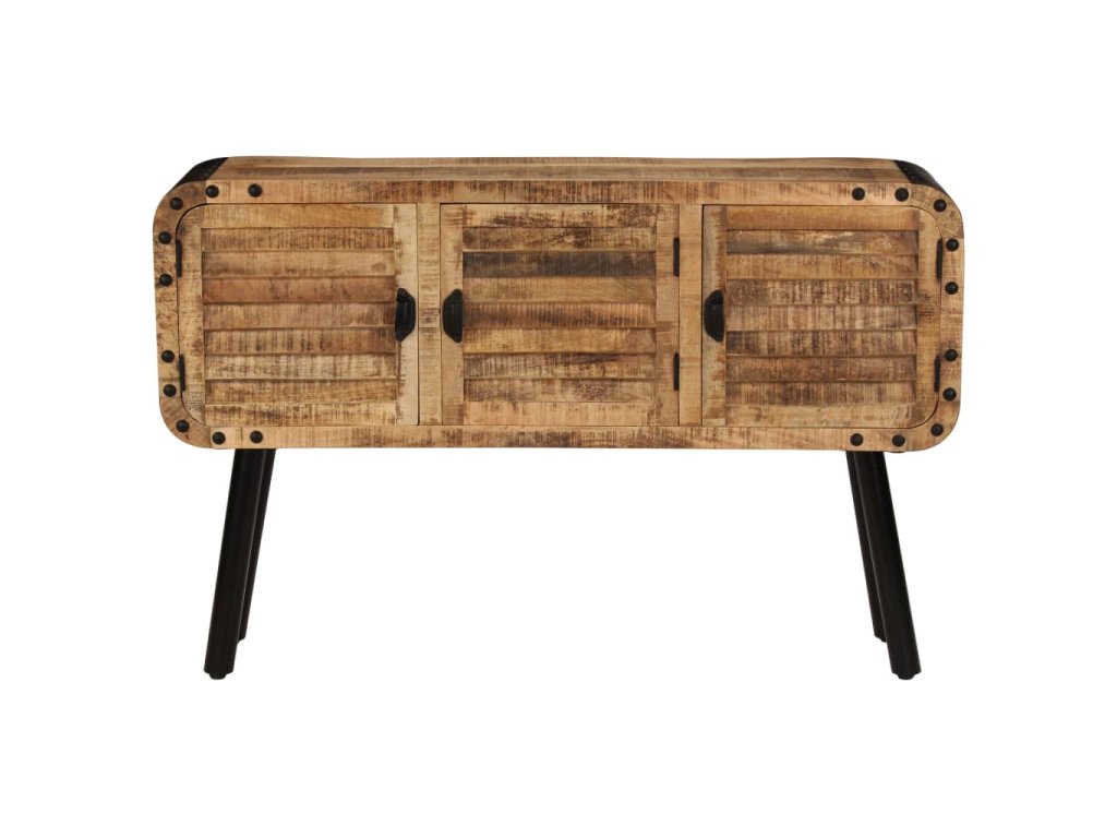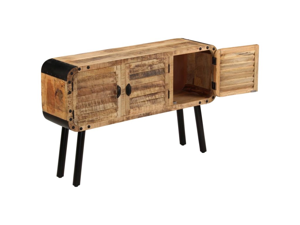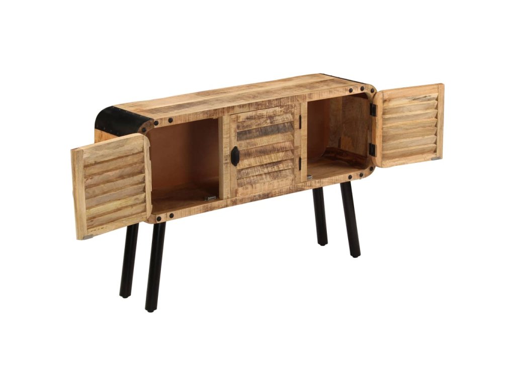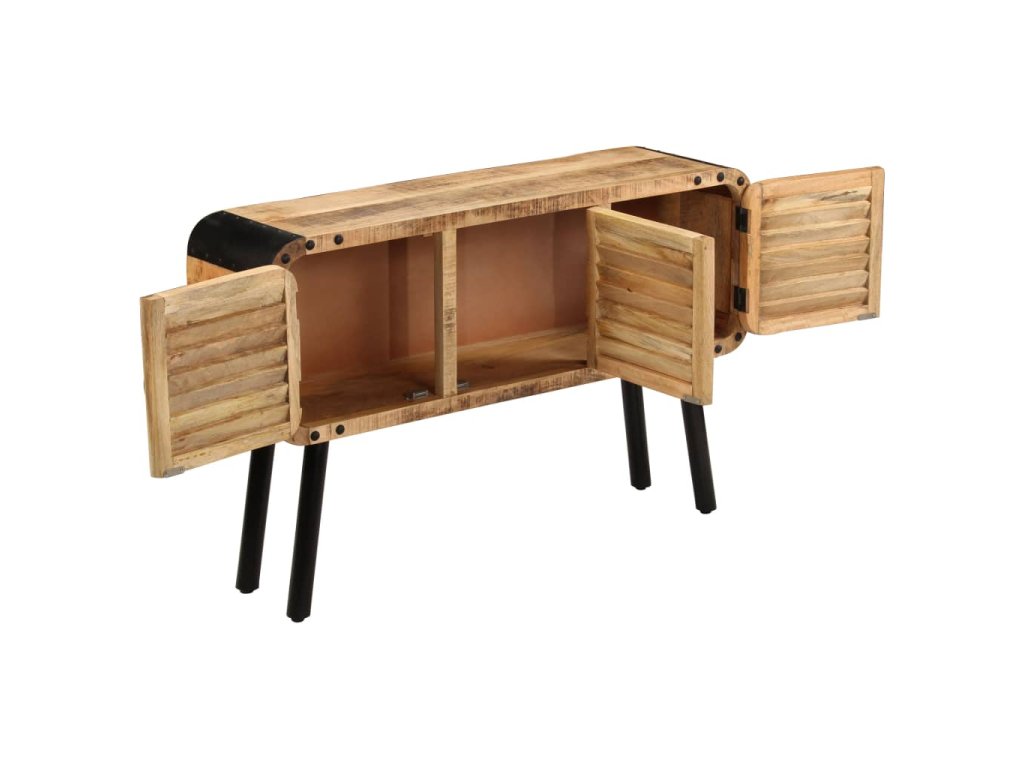 Příborník je vyrobena z masivního mangovníkového dřeva, které bylo vyleštěno a nalakováno, zachovalo si však svůj přírodní odstín a přirozené vzezření. Překrásná kresba dřeva činí každý kus nábytku zcela jedinečným a lehce odlišným od ostatních. Příborník má pevnou a stabilní horní desku, na niž můžete pokládat košíky s ovocem, vázy či jiné dekorativní předměty. Disponuje rovněž velkou skříňkou se 3 dvířky, která vám poskytne dodatečný úložný prostor. Kovové prvky přispívají k industriálnímu vzhledu příborníku. Montáž je snadná.