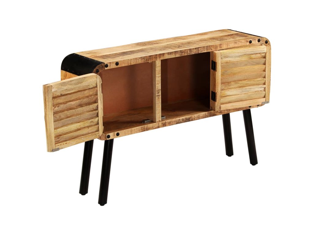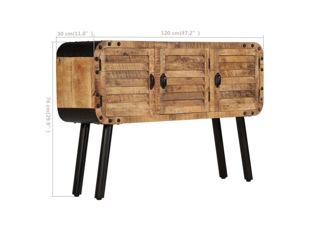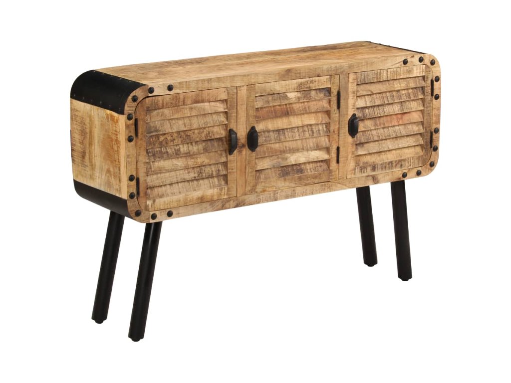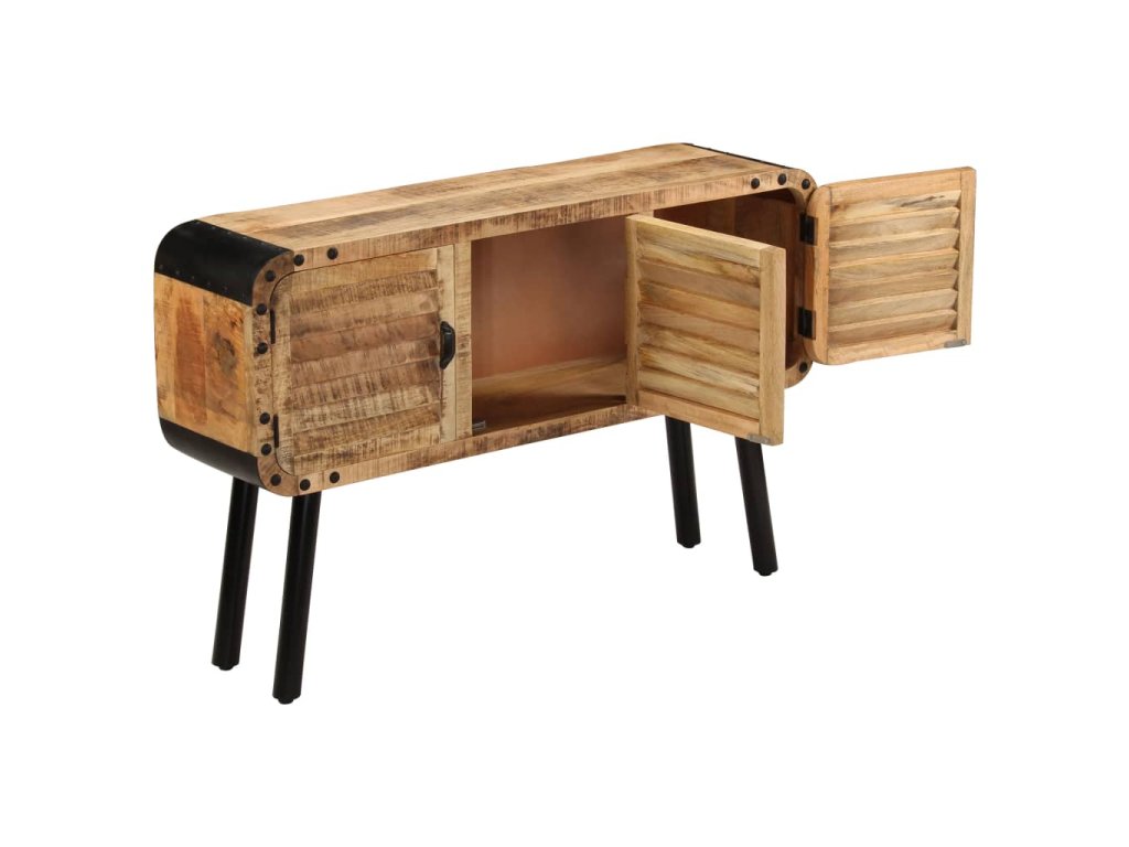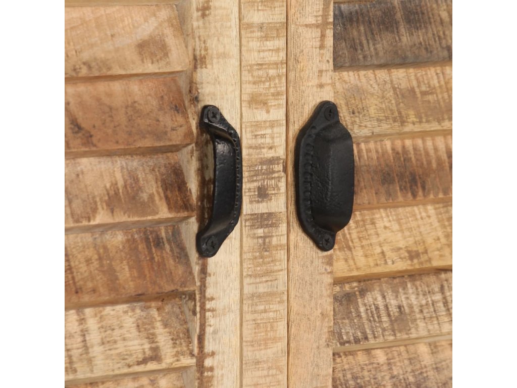 Příborník je vyrobena z masivního mangovníkového dřeva, které bylo vyleštěno a nalakováno, zachovalo si však svůj přírodní odstín a přirozené vzezření. Překrásná kresba dřeva činí každý kus nábytku zcela jedinečným a lehce odlišným od ostatních. Příborník má pevnou a stabilní horní desku, na niž můžete pokládat košíky s ovocem, vázy či jiné dekorativní předměty. Disponuje rovněž velkou skříňkou se 3 dvířky, která vám poskytne dodatečný úložný prostor. Kovové prvky přispívají k industriálnímu vzhledu příborníku. Montáž je snadná.