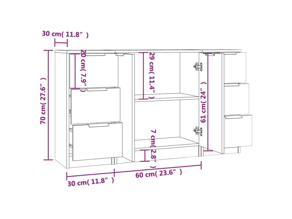 - Rozměry (příborník se 2 dvířky): 60 x 30 x 70 cm (Š x H x V)