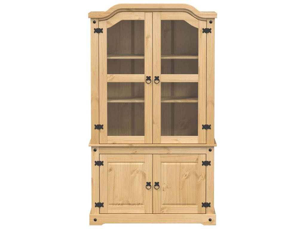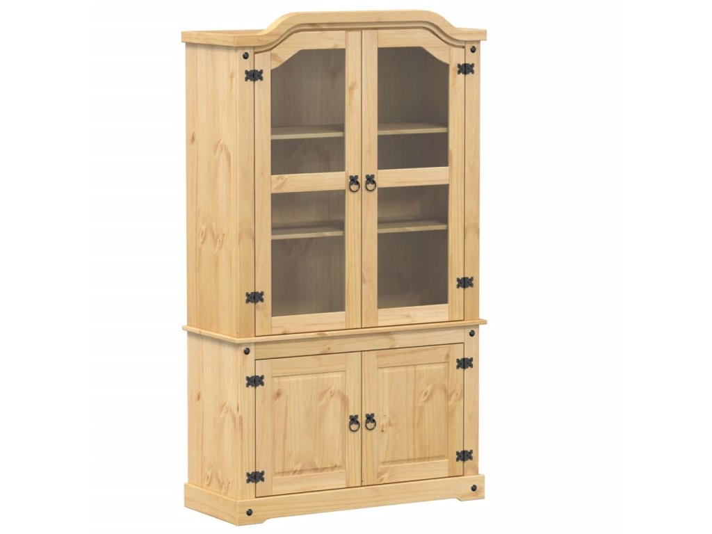 - Masivní borové dřevo: Masivní borové dřevo je krásný přírodní materiál. Borové dřevo má rovnou kresbu a obsahuje suky, které materiálu dodávají jeho charakteristický, rustikální vzhled. Vitrína je vyrobena z masivního borového dřeva, je tedy odolná a robustní.