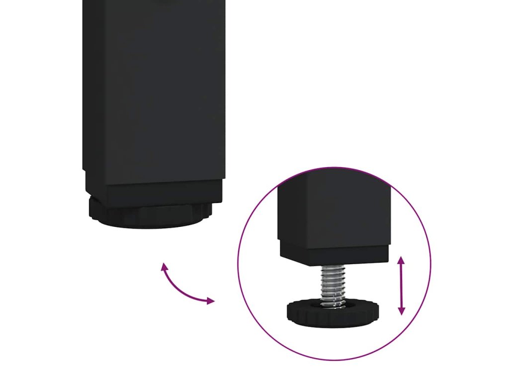 - Nastavitelné nožičky: Nastavitelné nožičky s plastovými podložkami udržují stojící stůl v rovnováze na nerovném povrchu a zvyšují jeho stabilitu.