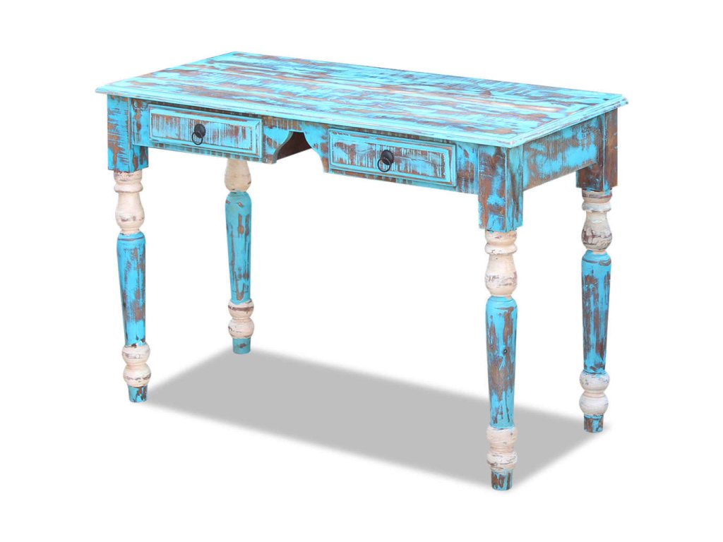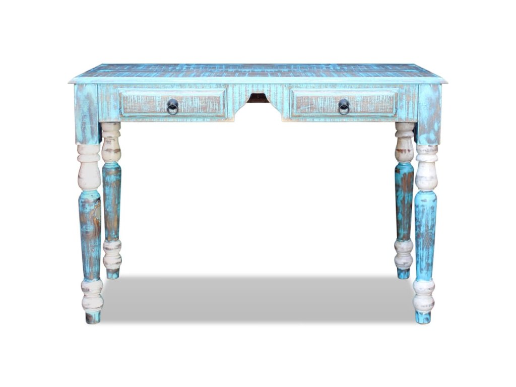 Tento dřevěný psací stůl ve vintage stylu, vyrobený z masivního recyklovaného dřeva, bude ve vaší domácnosti nadčasovým kusem nábytku. Stolní deska poskytuje stabilní a bezpečnou plochu k odkládání nápojů, košíků s ovocem, váz či dalších dekorativních předmětů. Jeho dvě zásuvky vám poskytnou spoustu místa na ukládání drobností, jako jsou klíče, poznámkové bloky a další maličkosti. Stůl se dá používat jako konzolový stolek, odkládací stůl, PC stůl, pracovní stůl, kancelářský stůl, stůl na čtení a studium apod.