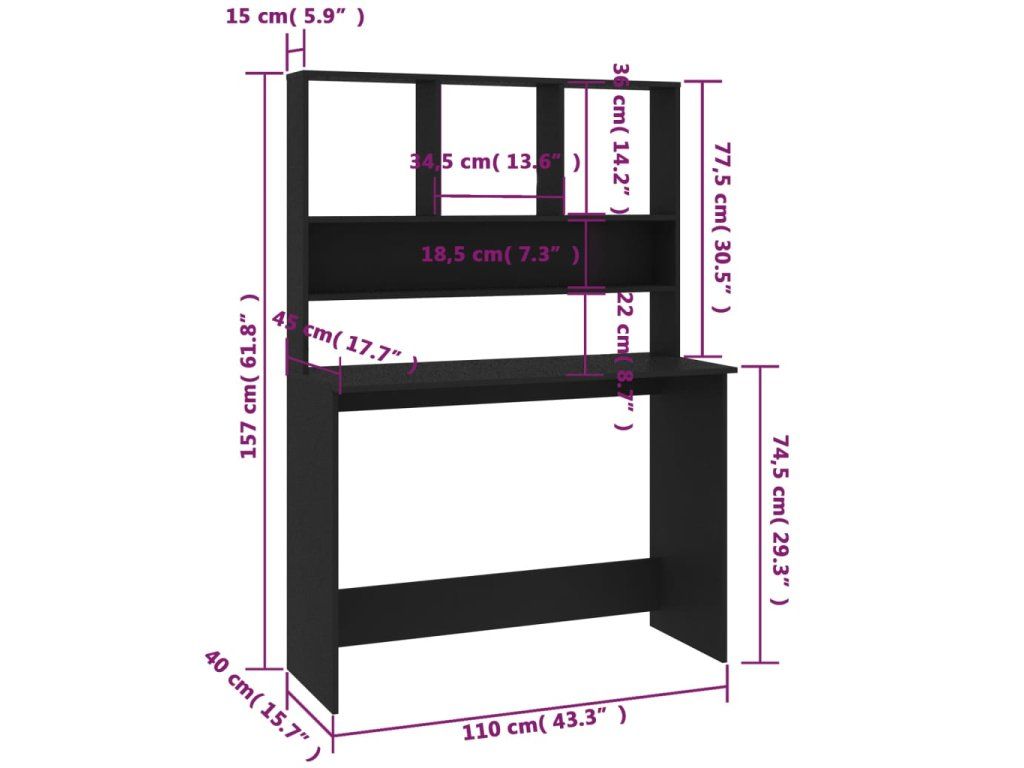 Psací stůl je vyrobený z kvalitní dřevotřísky, která zajišťuje jeho odolnost, bytelnost a dlouhou životnost. Stylové a moderní rozvržení s oddělenými přihrádkami k ukládání a vystavování nejrůznějších věcí je perfektním řešením ke snadnému a přehlednému uspořádání vašich složek, dokumentů, poznámek, PC vybavení a dalších potřeb. Stůl nejen skvěle vypadá, ale je také velice praktický a pomůže vám ušetřit místo, výborně se proto hodí do miniaturních kanceláří, malých domečků a všude tam, kde chcete efektivně využít prostor.