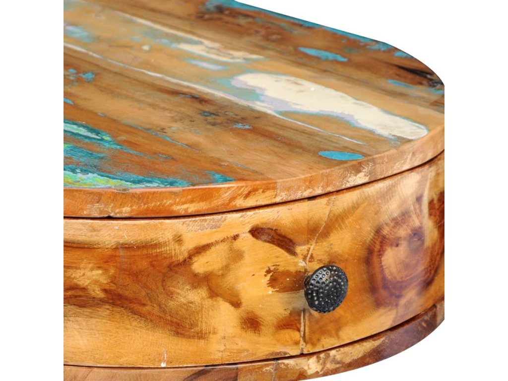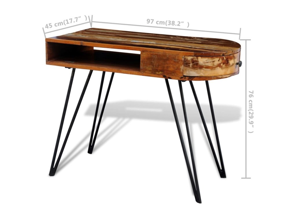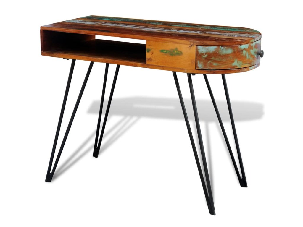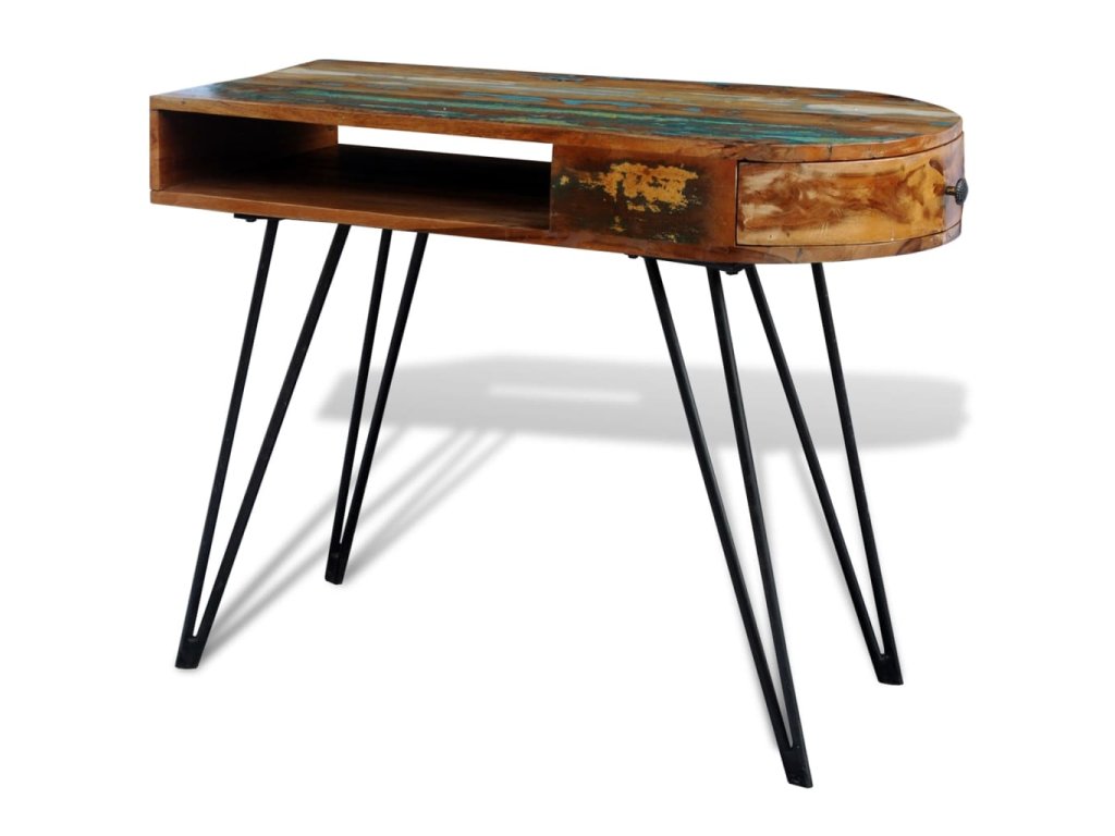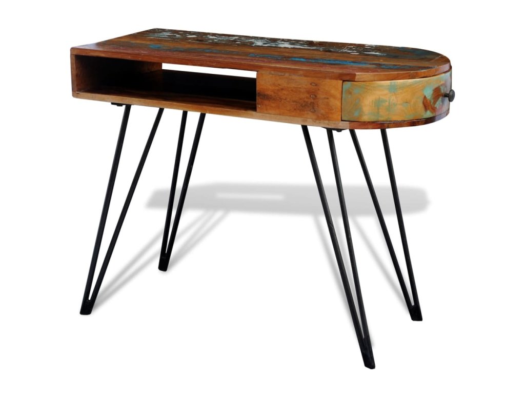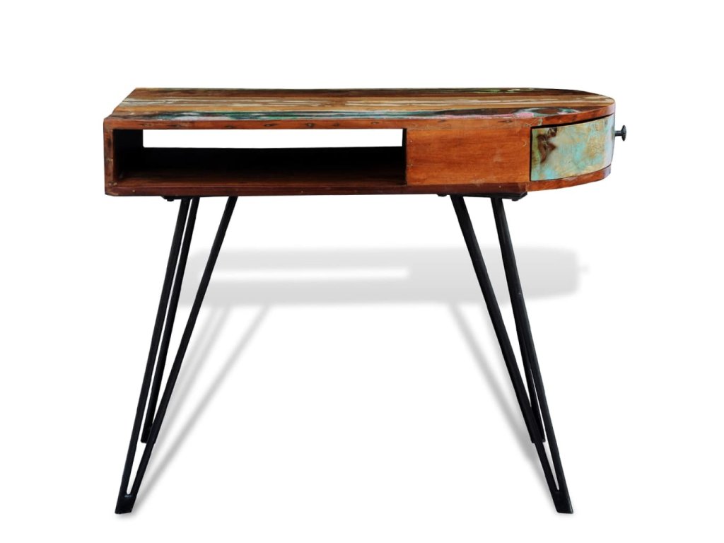 Tento vintage psací stůl z recyklovaného dřeva s pestrobarevnou stolní deskou a 4 bytelnými železnými nohami má dlouhou životnost a nadčasově doplní vaše bydlení. Masivní dřevěná stolní deska je perfektní plocha pro váš počítač, mobilní telefon, dekorace a podobě. Pod stolní deskou je přihrádka a na boku stolku zásuvka, které vám nabízí další úložný prostor.