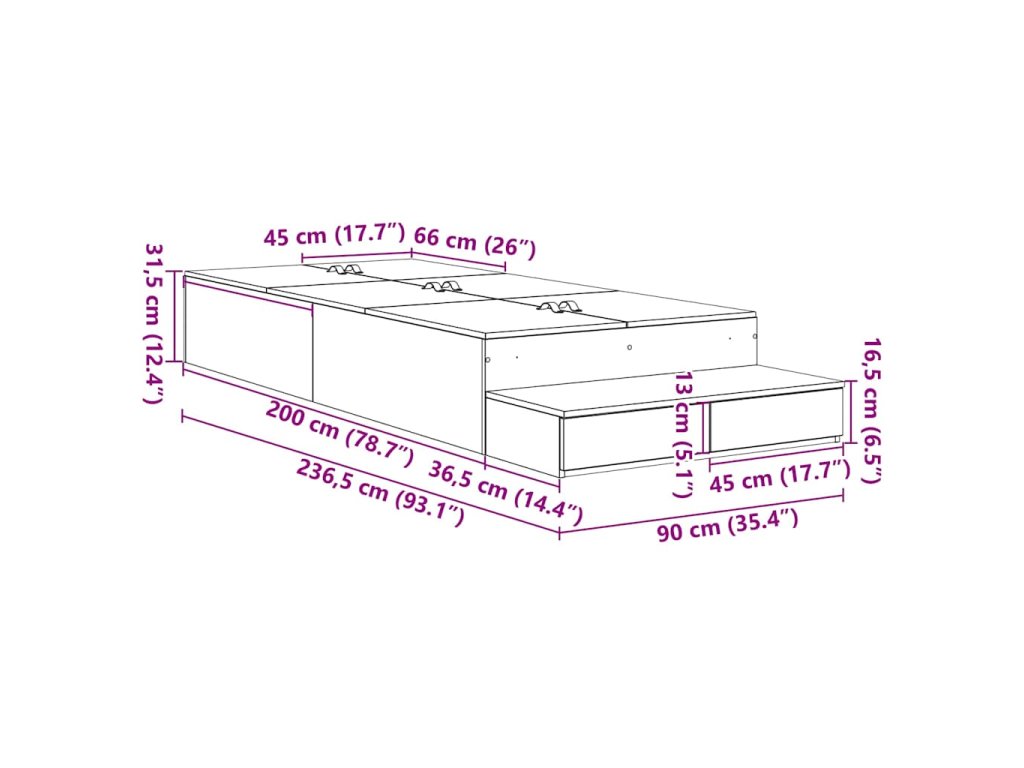 - Celkové rozměry: 236,5 x 90 x 31,5 cm (D x Š x V)