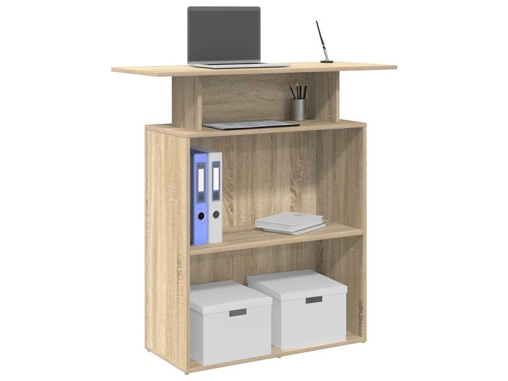 - Integrovaná úložná řešení: Recepční pult je vybaven vestavěnou policí, která poskytuje dostatek prostoru pro uložení kancelářských potřeb, dokumentů a osobních věcí, což pomáhá udržovat pracovní prostor organizovaný.