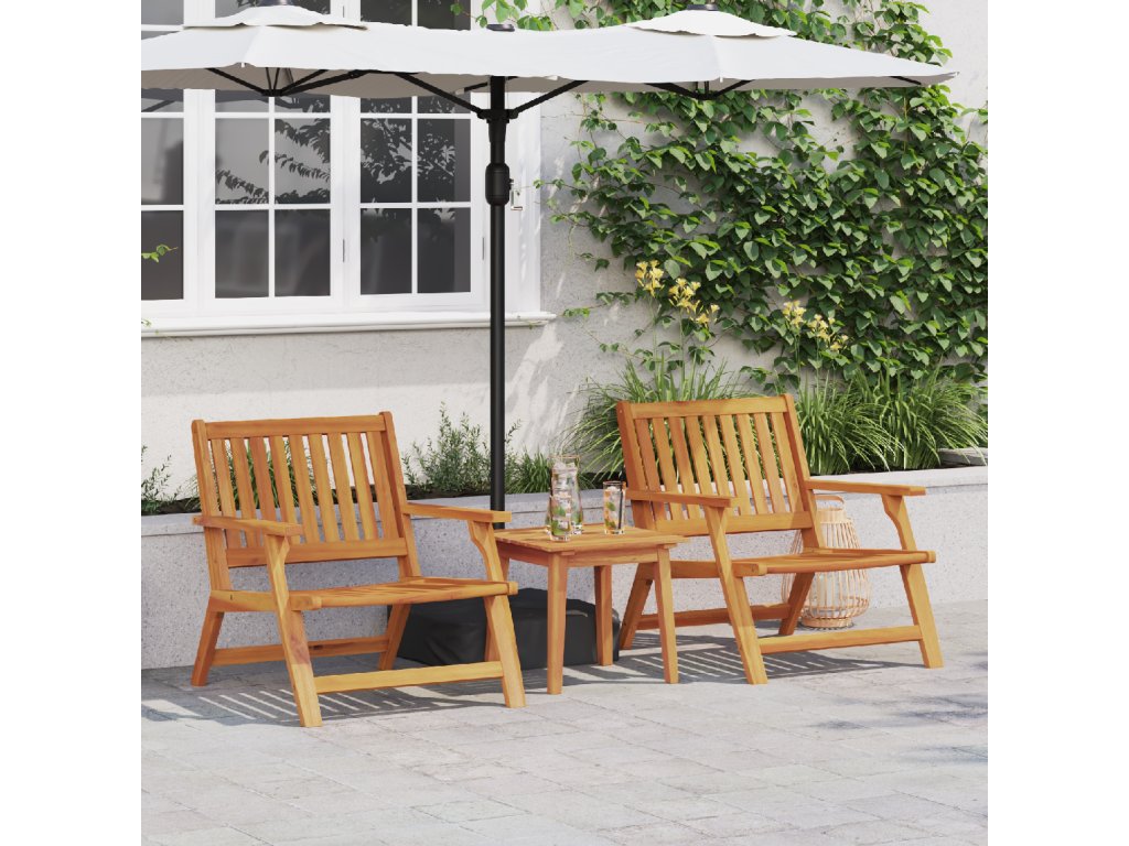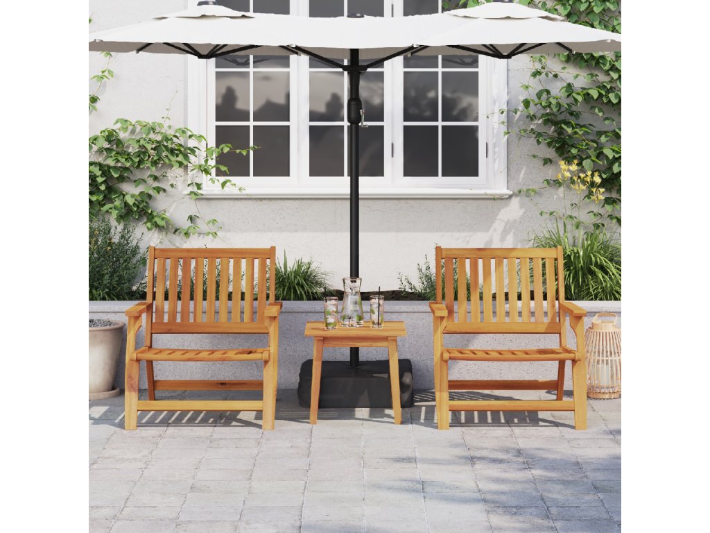 Tenhle set zahradních židlí z masivního akáciového dřeva spojuje pohodlí s klasickým stylem. Navržené na užití venku, mají silnou konstrukci a nadčasový vzhled, co je ideální volba pro tvou terasu nebo zahradu, a lákají k odpočinku během teplých večerů.