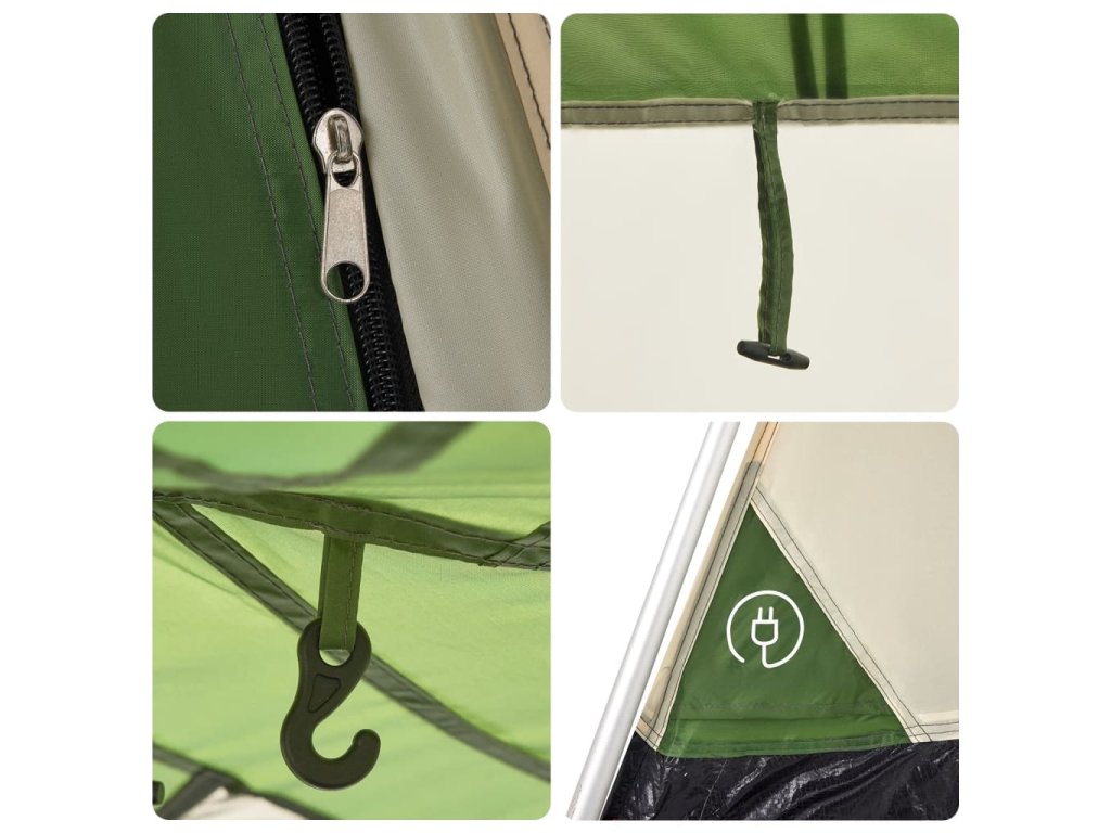 - Rychloupínací systém: Postavte stan snadno a bez námahy pomocí rychloupínacího systému! Stan položte na zem, roztáhněte předem sestavené tyče, dokud nezapadnou na své místo, a vše je hotovo!