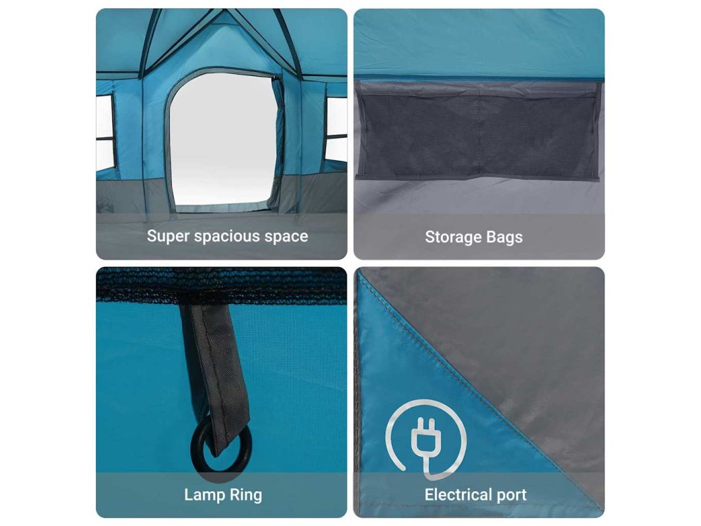 Tento kempovací stan pro 12 osob je skvělý na dobrodružství venku. Nabízí spoustu prostoru pro rodinu a přátele, aby si odpočinuli a užili si přírodu. Díky jeho stylovému modrému designu a praktickému uspořádání se zaměřuje na pohodlí a funkčnost na vašich kempovacích výletech a činí každou příležitost nezapomenutelnou.