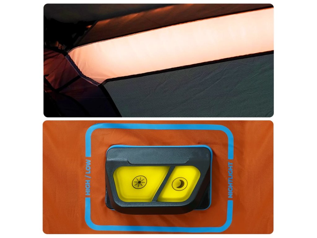 - Pohodlné používání: Vchod na zip umožňuje pohodlný vstup a výstup z turistického stanu. Outdoorový stan je navíc vybaven E-portem, který umožňuje průchod kabelů pro připojení ke zdroji energie. Stan je opatřen kapsami pro uložení drobných předmětů a vestavěným LED osvětlením. Disponuje 3 rovnoměrně rozloženými režimy osvětlení: silné světlo, slabé světlo a noční světlo. Režim osvětlení můžete změnit stisknutím tlačítka přepínače.