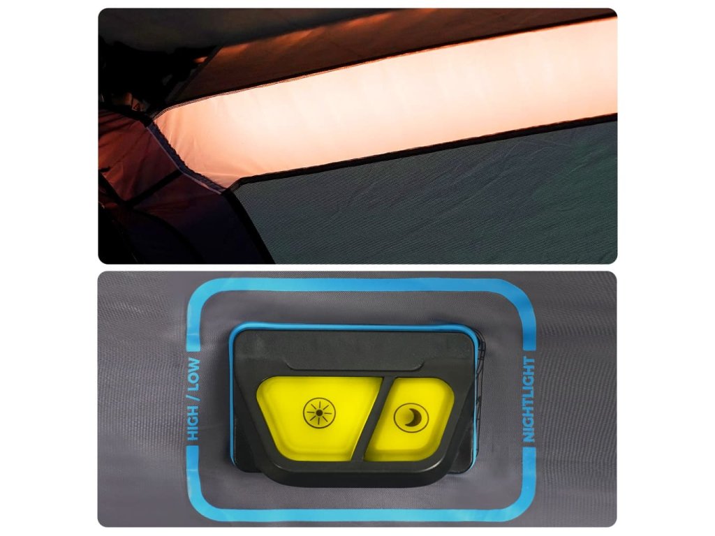 - Pohodlné používání: Vchod na zip umožňuje pohodlný vstup a výstup z turistického stanu. Outdoorový stan je navíc vybaven E-portem, který umožňuje průchod kabelů pro připojení ke zdroji energie. Stan je opatřen kapsami pro uložení drobných předmětů a vestavěným LED osvětlením. Disponuje 3 rovnoměrně rozloženými režimy osvětlení: silné světlo, slabé světlo a noční světlo. Režim osvětlení můžete změnit stisknutím tlačítka přepínače.