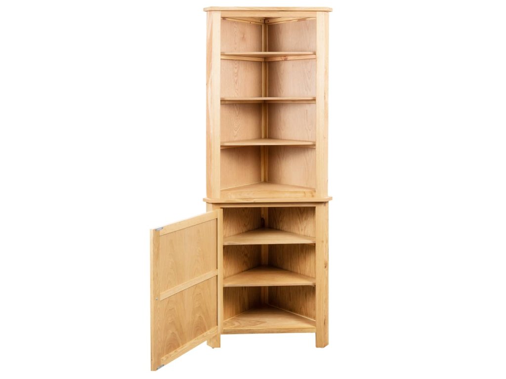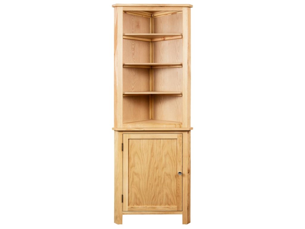 Tato rohová skříňka, která je vyrobená z masivního dubu a MDF s dubovou dýhou, je pevná a odolná a krásně se vejde do 90 stupňového rohu. Disponuje dostatečným úložným prostorem, kam si můžete přehledně uschovat různé potřeby do domácnosti a dekorativní předměty, jako jsou knihy, šálky, květiny v květináčích atd., abyste je zároveň měli po ruce.